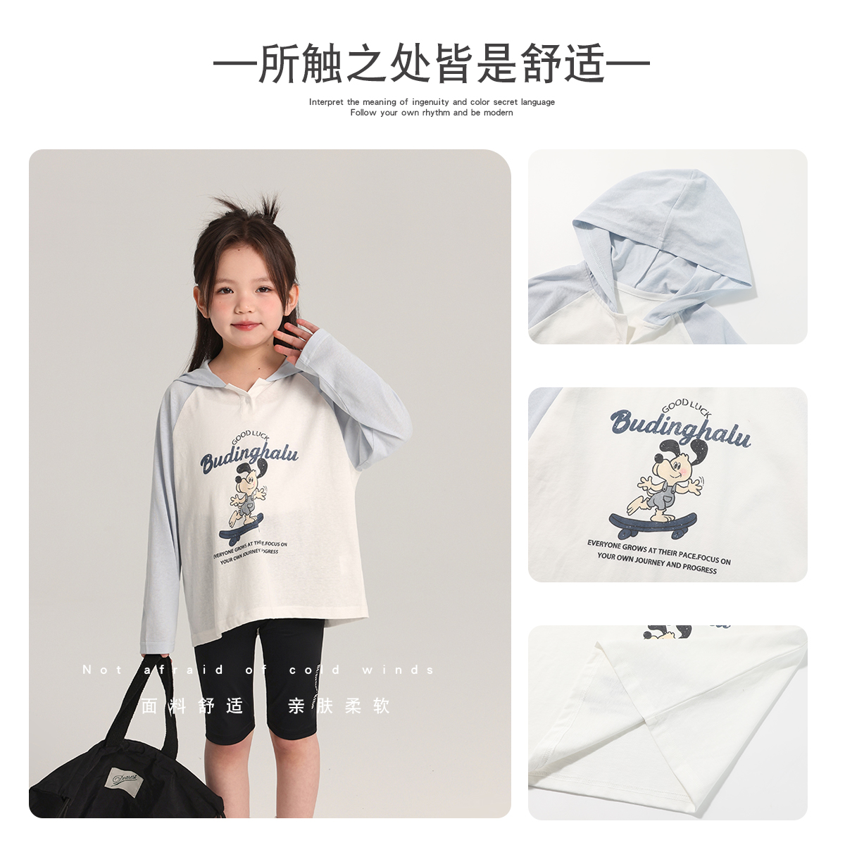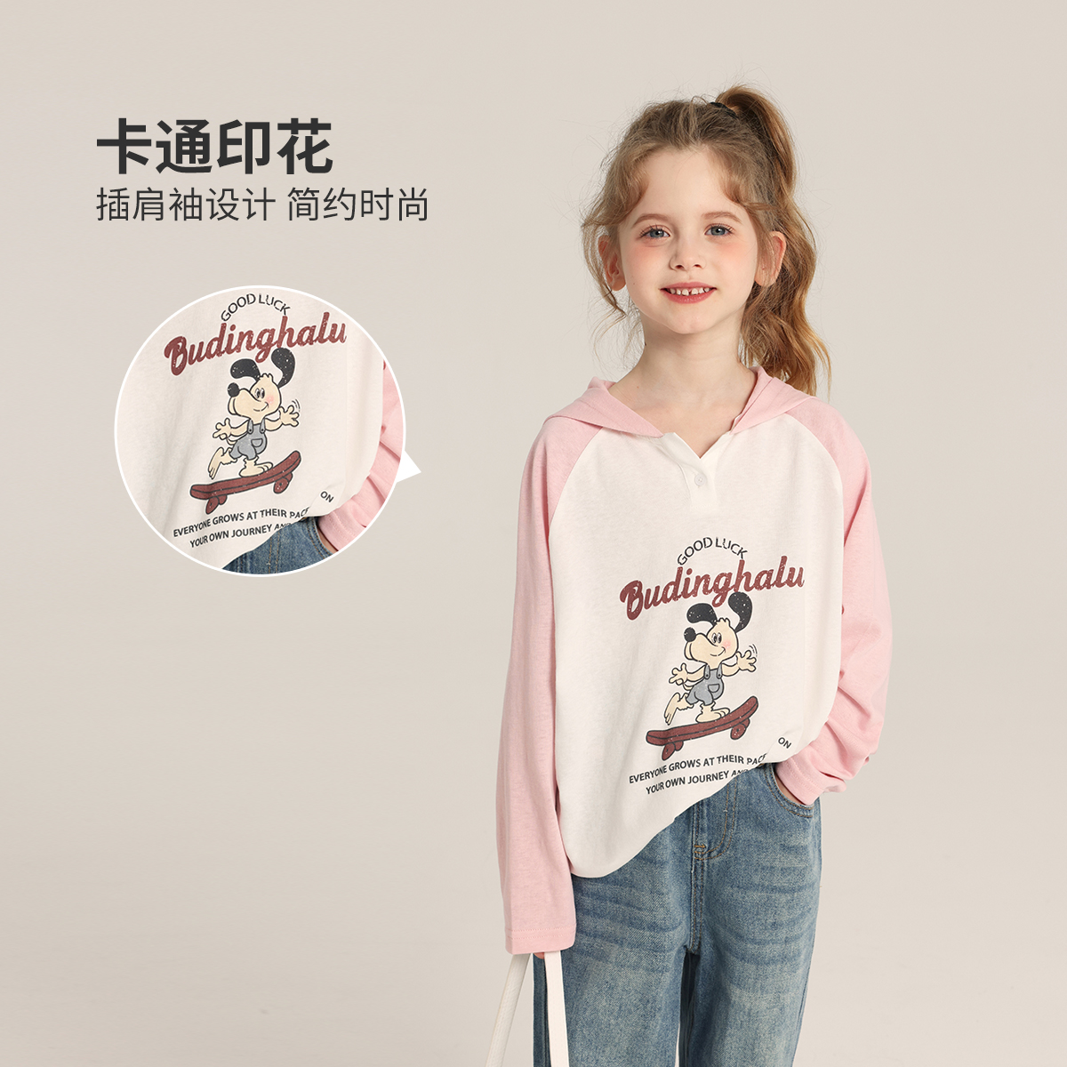 布丁哈鲁童装春装女童洋气2025春秋新款儿童百搭圆领卡通长袖T恤