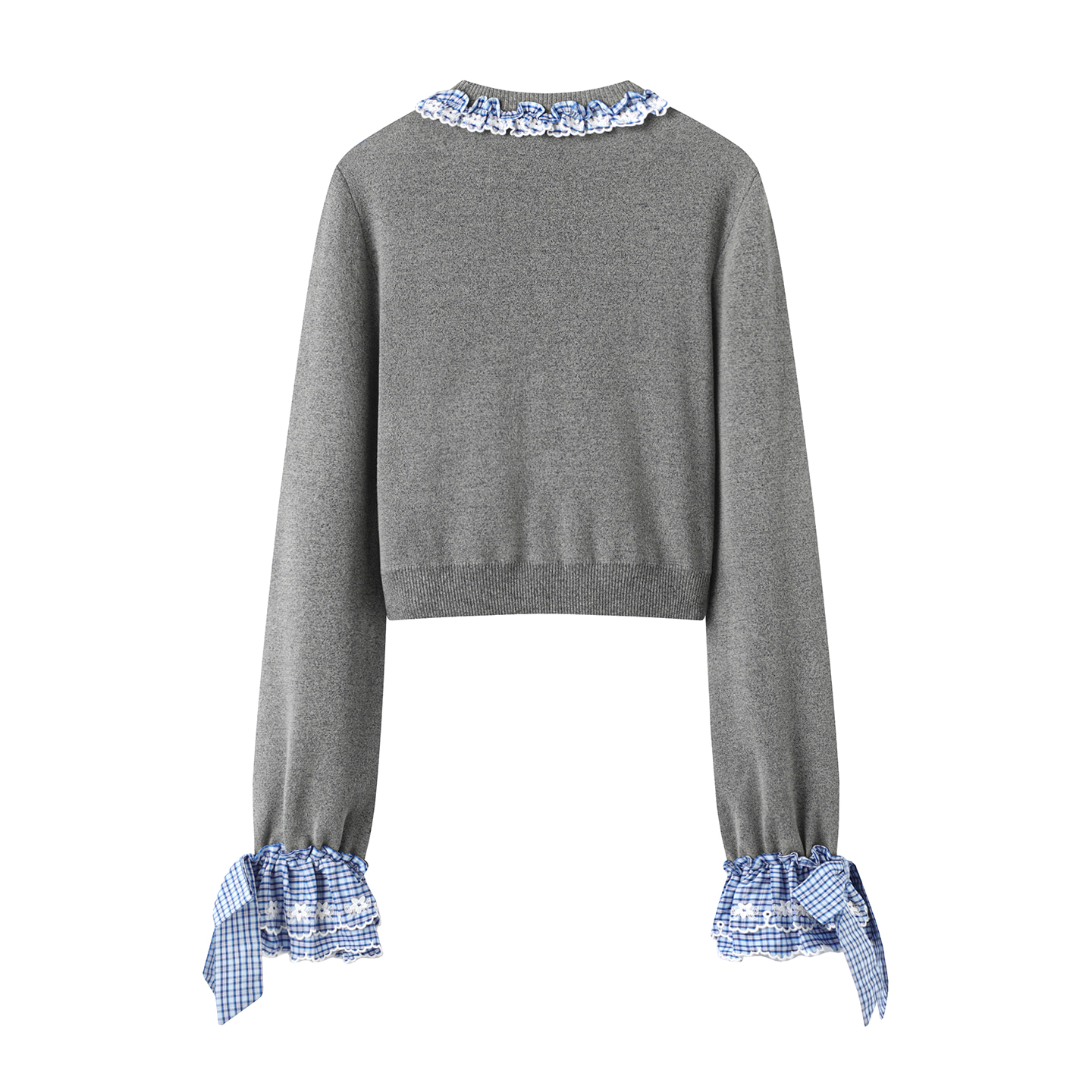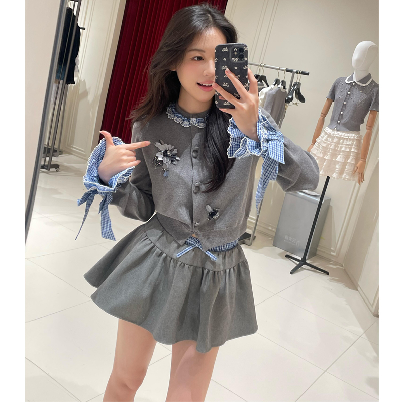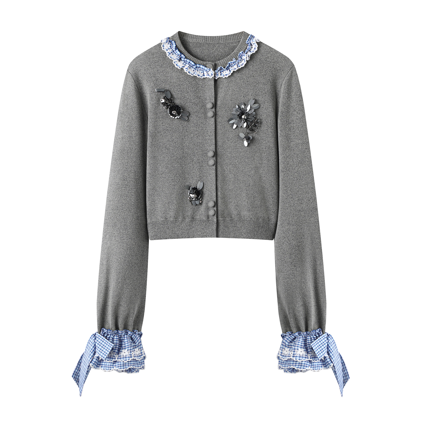 miu系针织衫2025秋季新品小香风格子花边重工钉珠短款开衫毛衣女