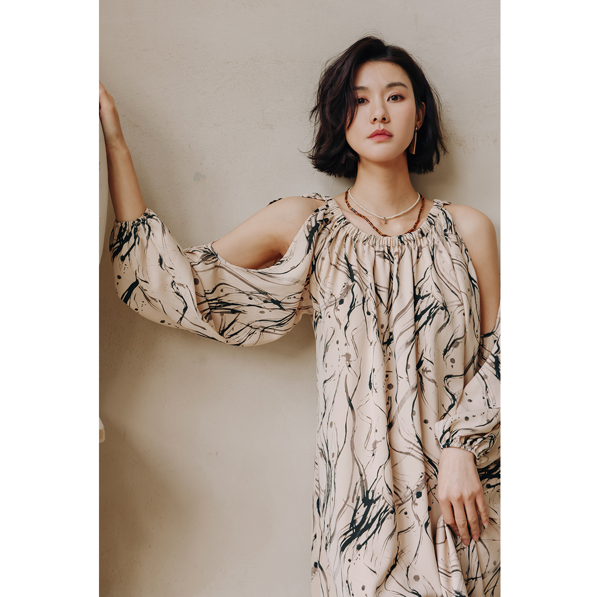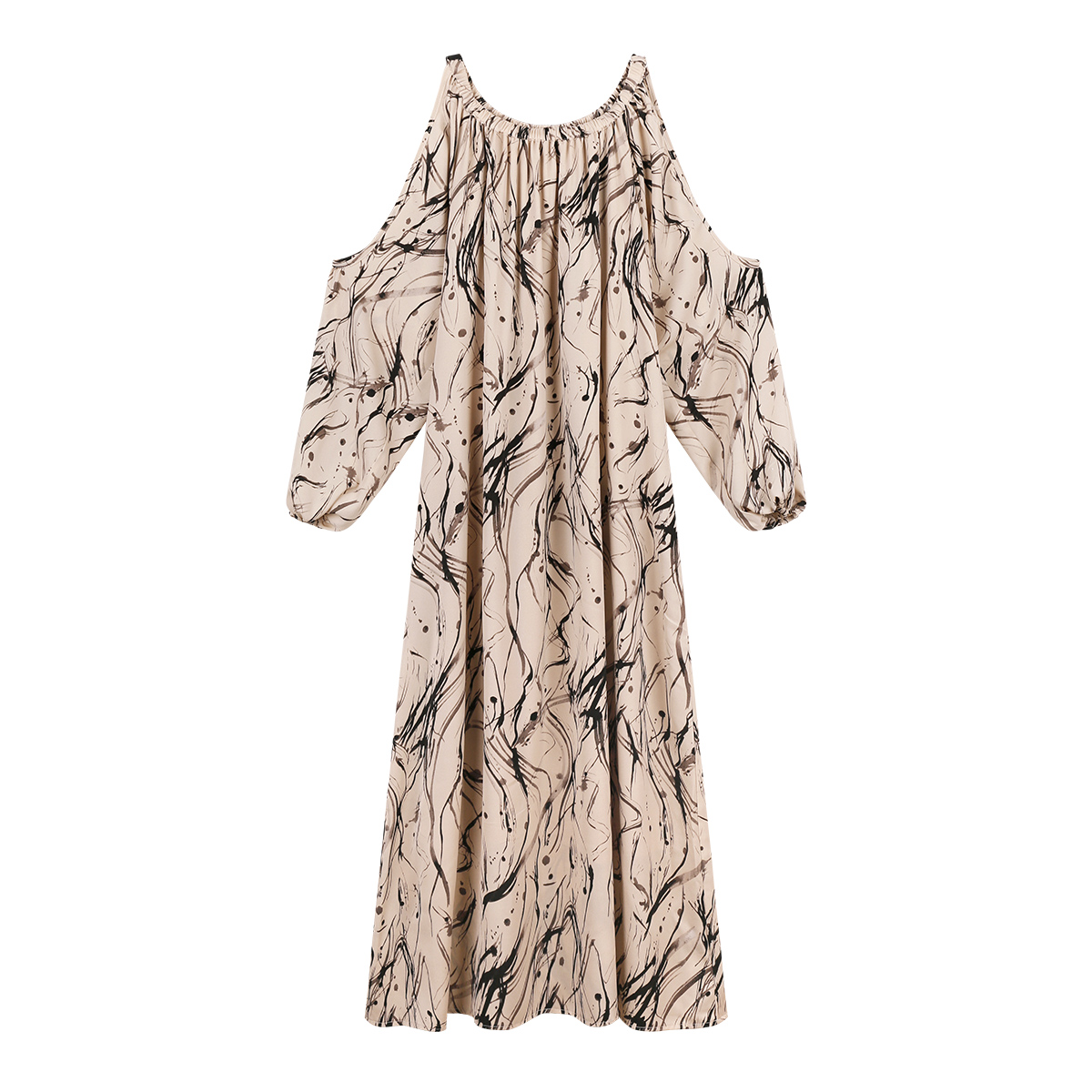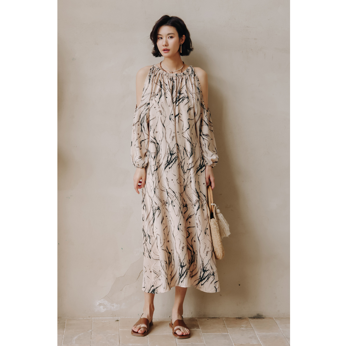 弥古法式挂脖长袖露肩连衣裙女夏海边度假沙滩长裙高级感雪纺裙子