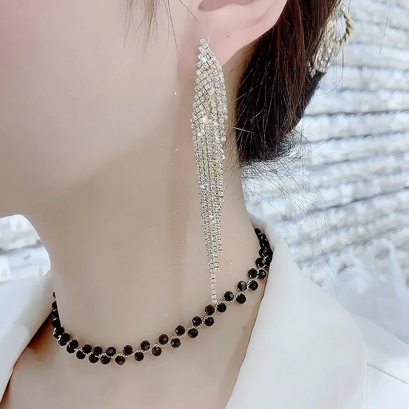 时尚女王长款流苏礼服耳环新款S925纯银针满钻精致高级感宴会耳饰
