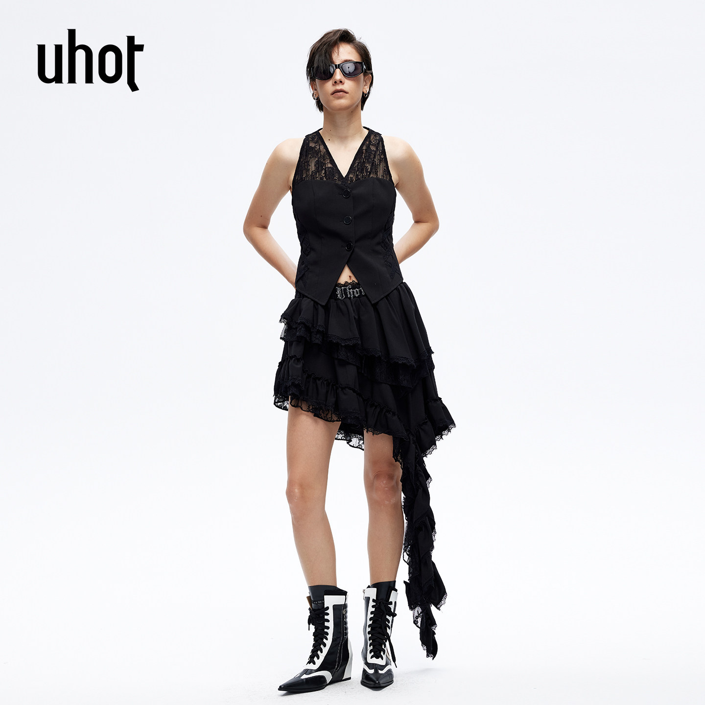 uhot/诱货26春黑色荷叶边短裙流光甜酷风蕾丝拼接半身裙UWLS2Q043