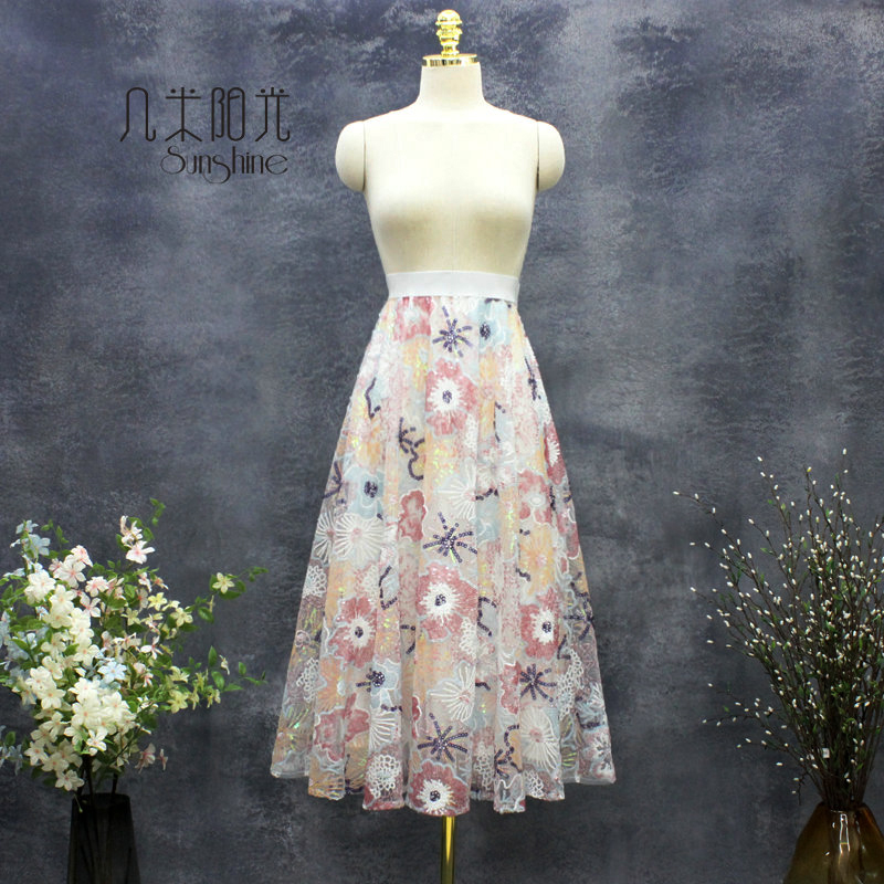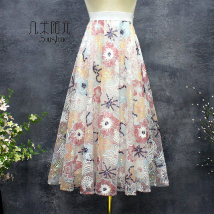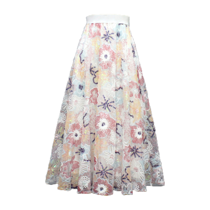 2025高档重工亮片绣花裙时尚闪闪花朵半身裙垂感显瘦网纱裙长裙