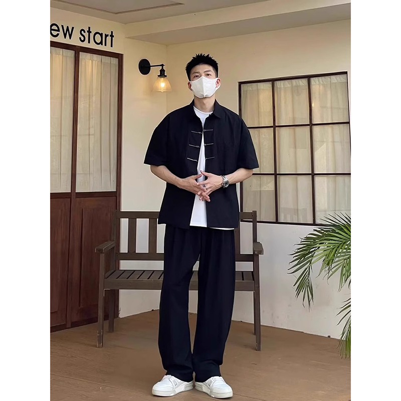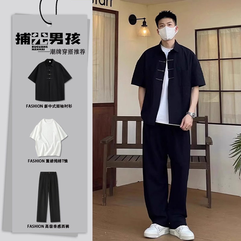 新中式飞机扣短袖衬衫男生成熟稳重穿搭套装垂感西裤夏日订婚衣服