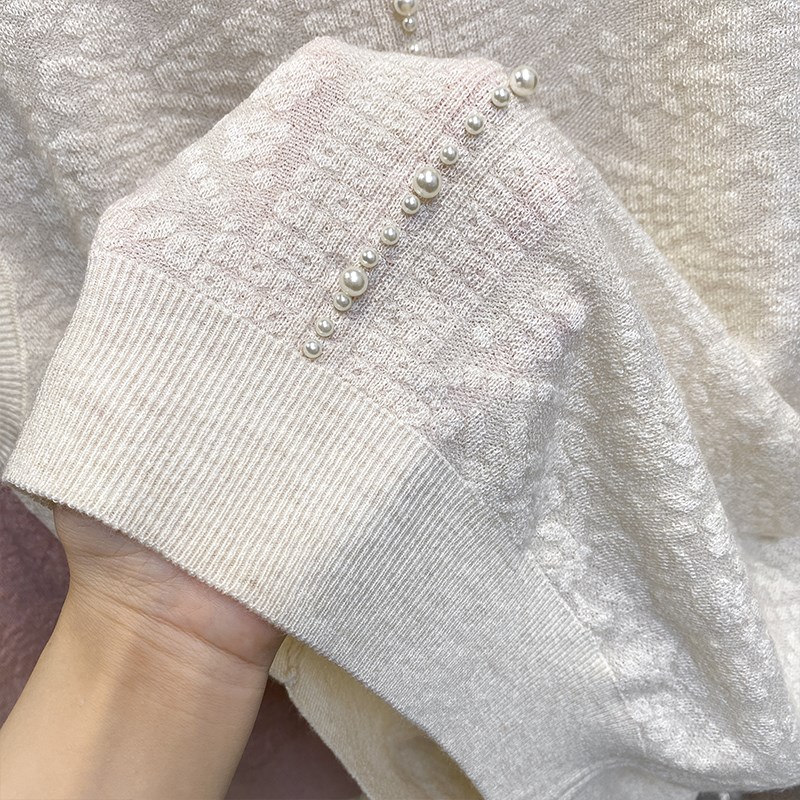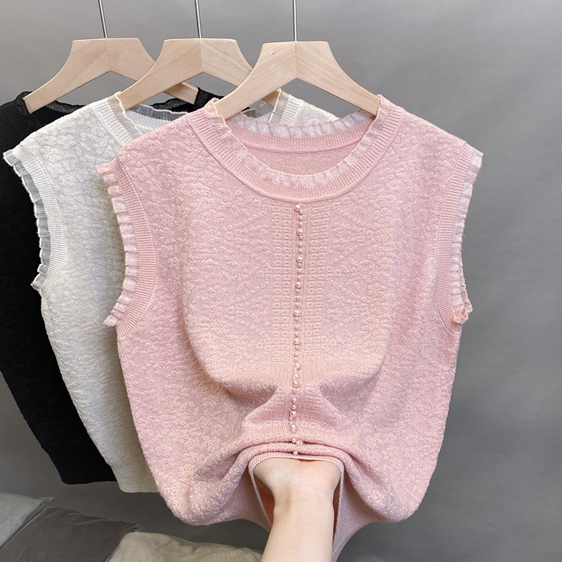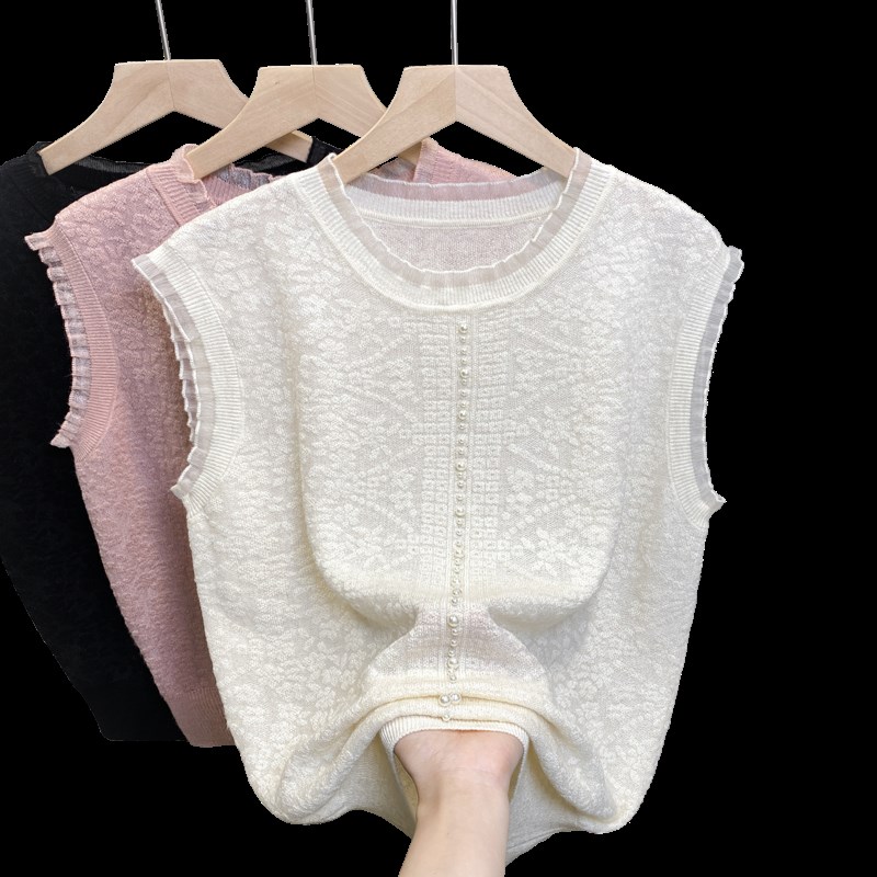 圆领蕾丝针织衫女2025夏装新款宽松外穿钉珠上衣内搭无袖背心t恤