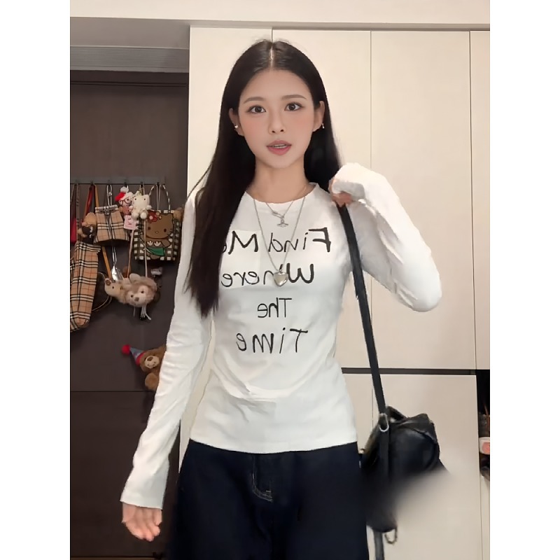 大码韩系印花时尚圆领长袖正肩t恤女早秋修身显瘦气质打底衫上衣