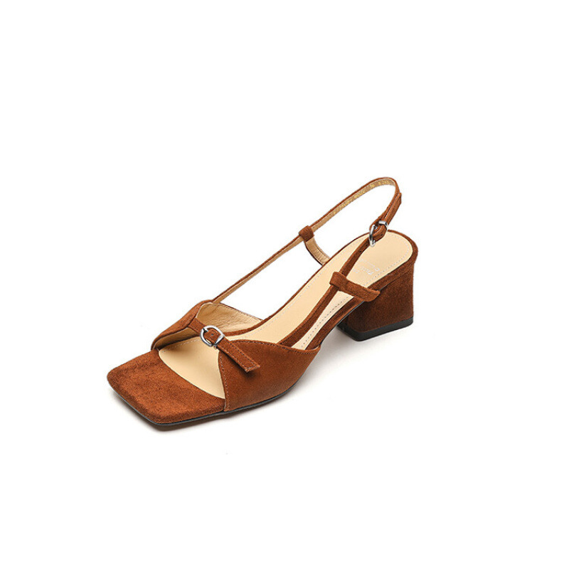 法式真皮一字扣露趾高跟凉鞋女2025夏季外穿粗跟方头中跟罗马