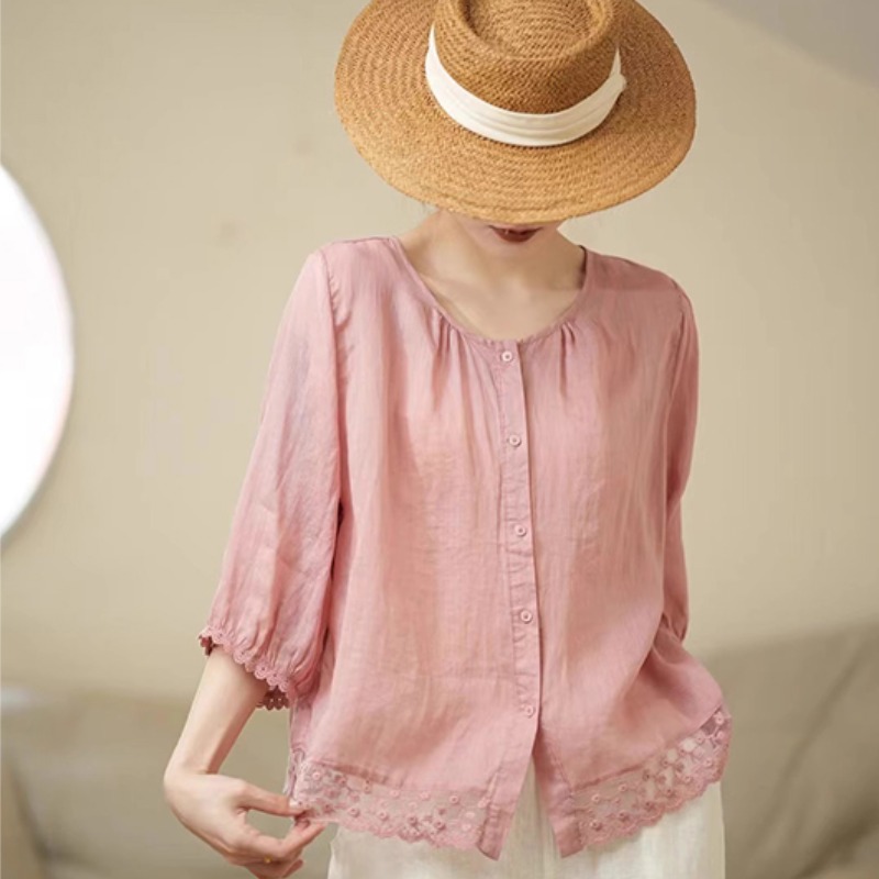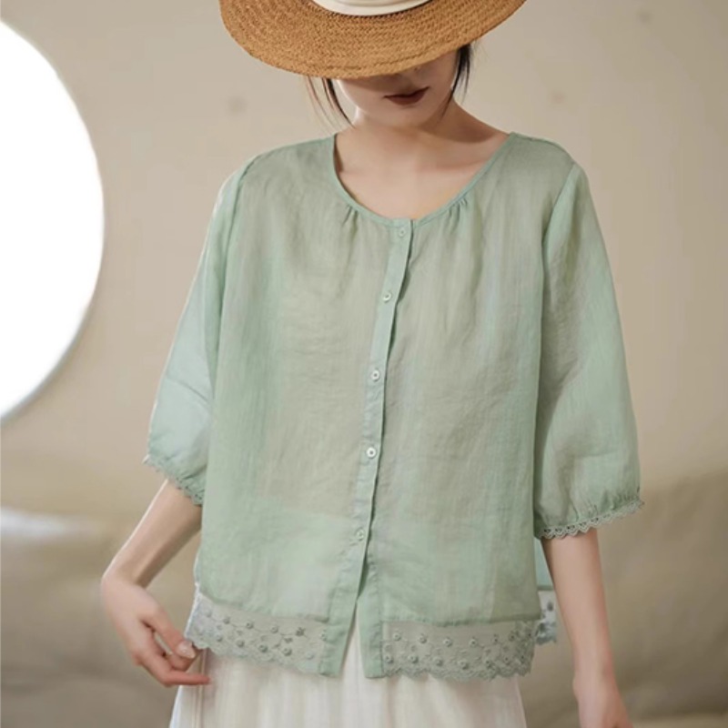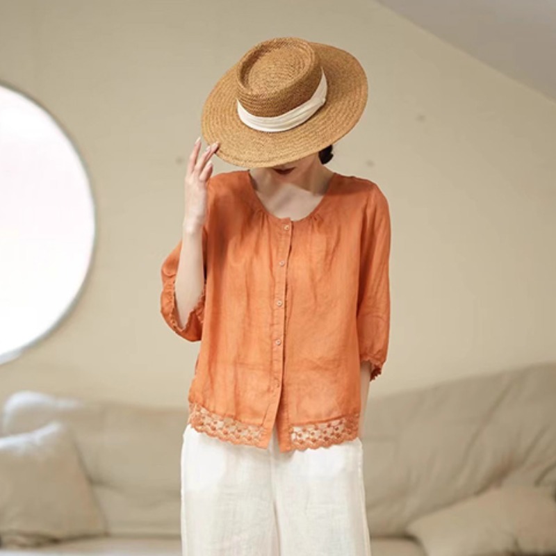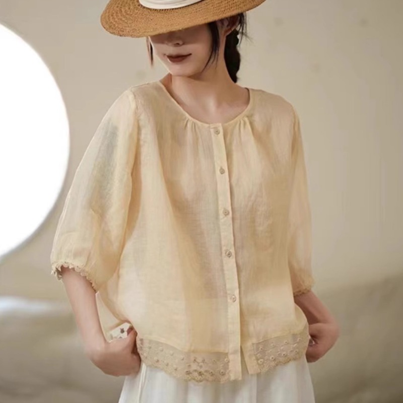 复古气质拼接蕾丝花边苎麻衬衫女夏季宽松薄款禅意七分袖亚麻上衣