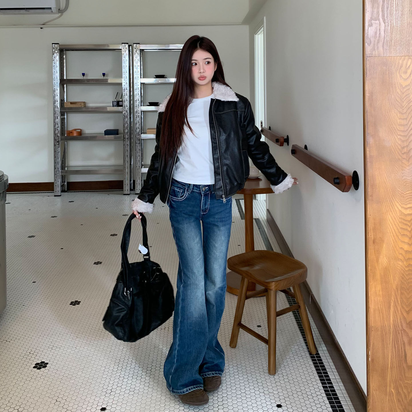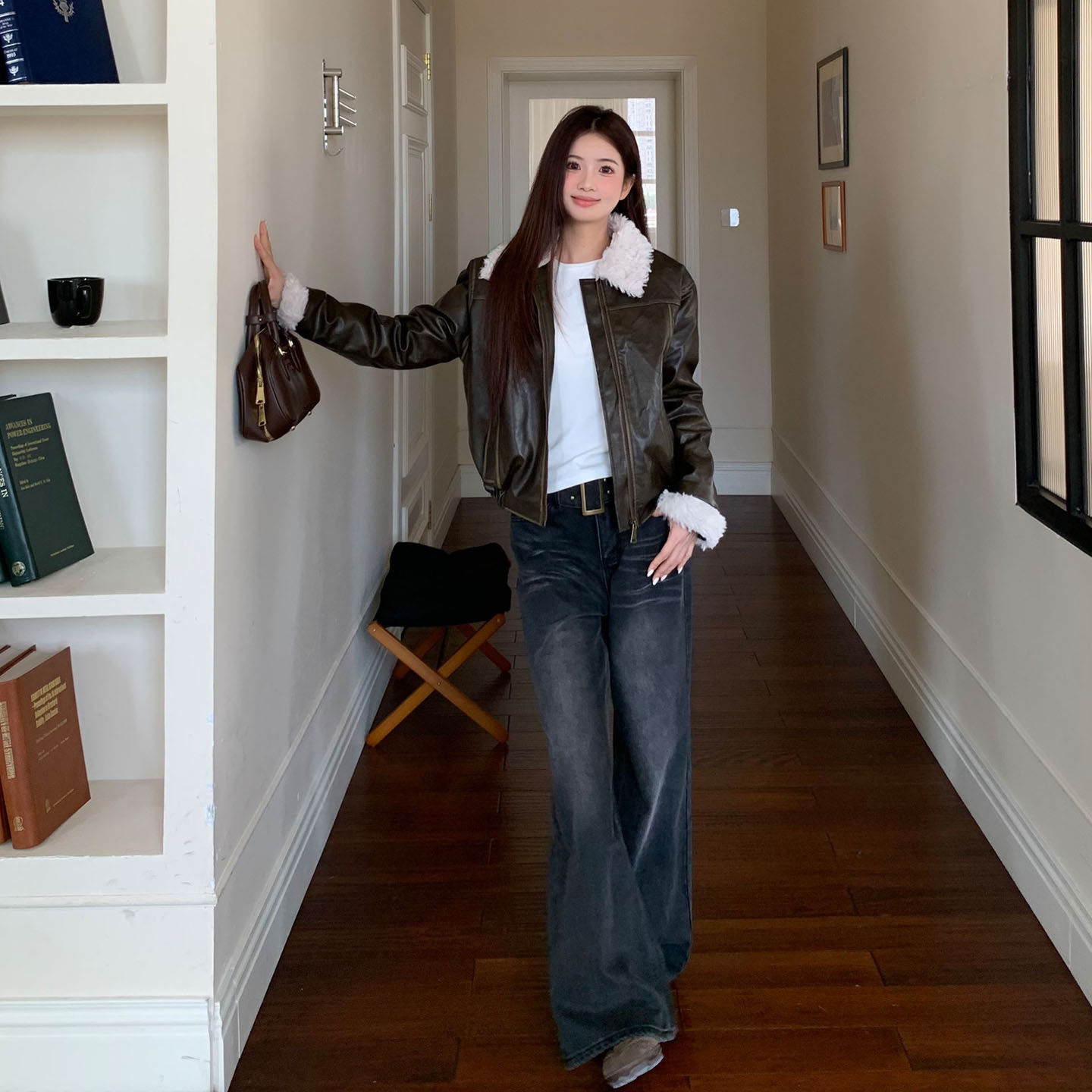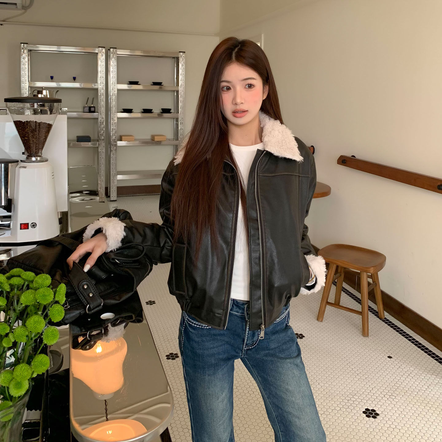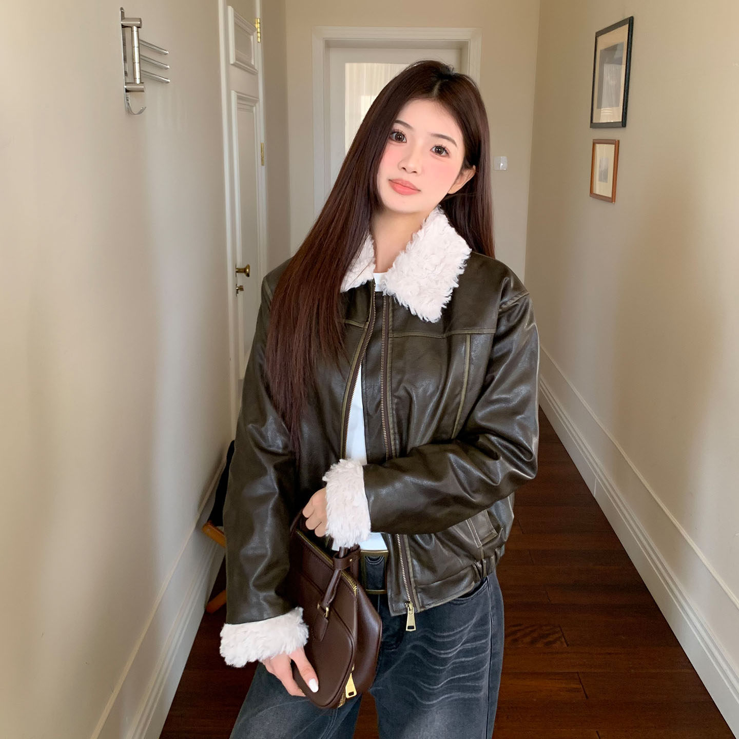 橘子树在哪儿美式翻领pu皮衣夹棉外套冬季女款宽松机车风短款夹克