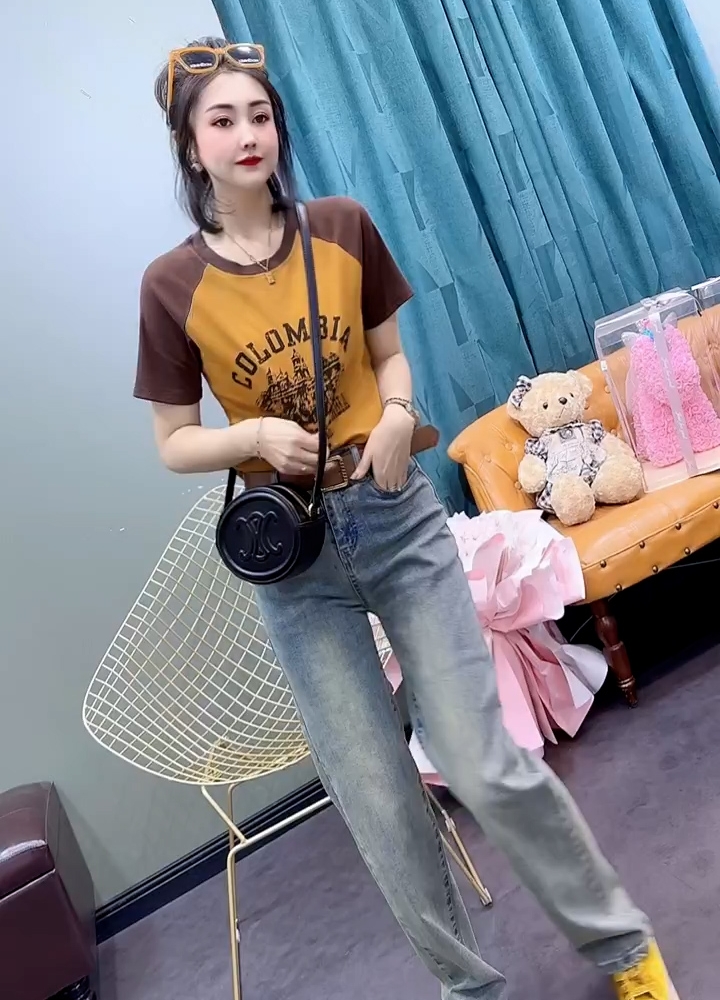 欧货2025夏季新款美式复古印花纯棉短袖T恤女修身高弹插肩袖上衣