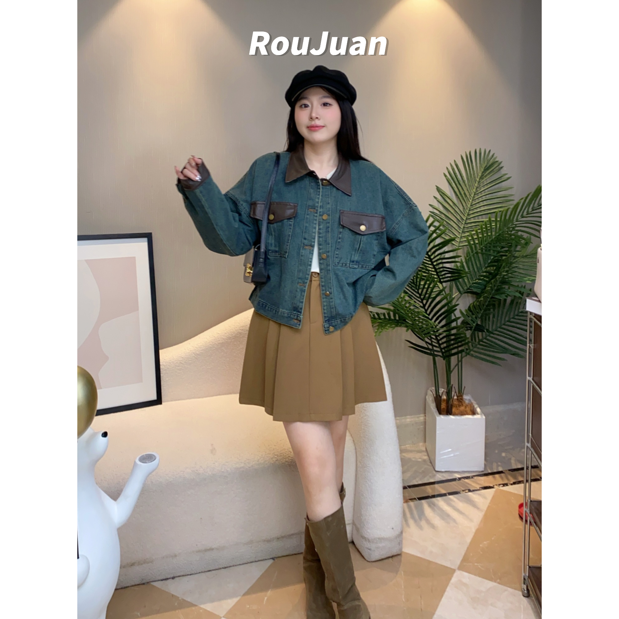 肉卷家微胖大码女装街头休闲PU皮拼接风复古重工长袖牛仔外套