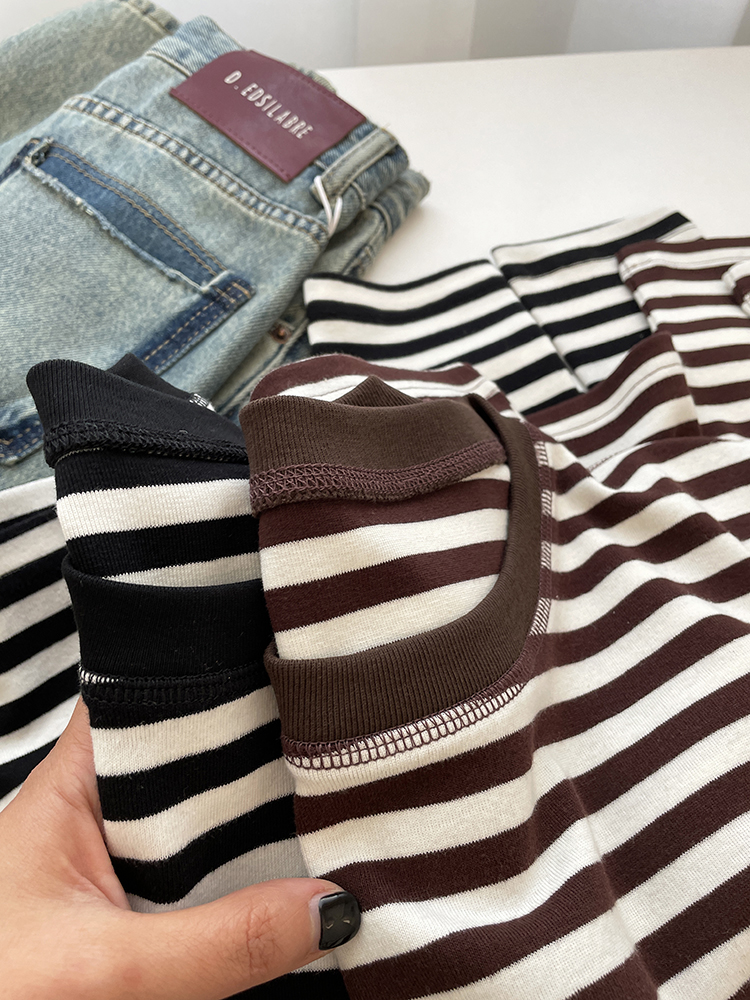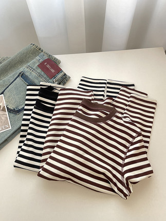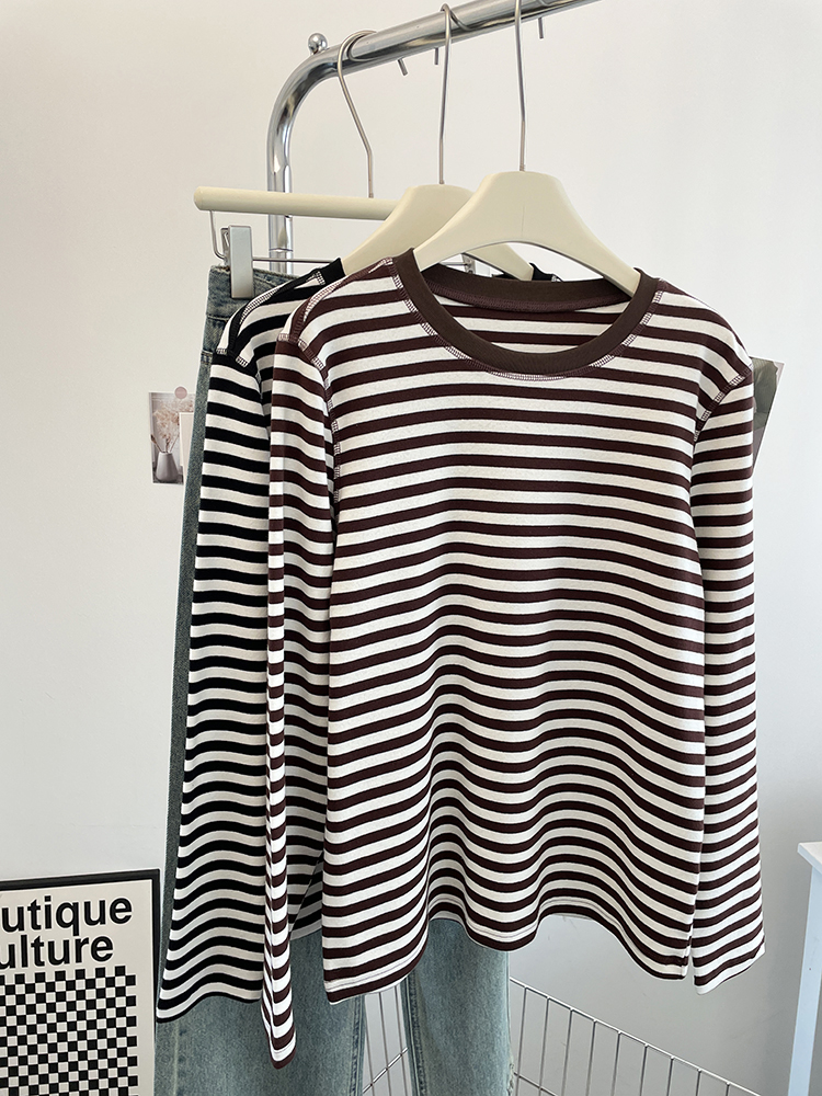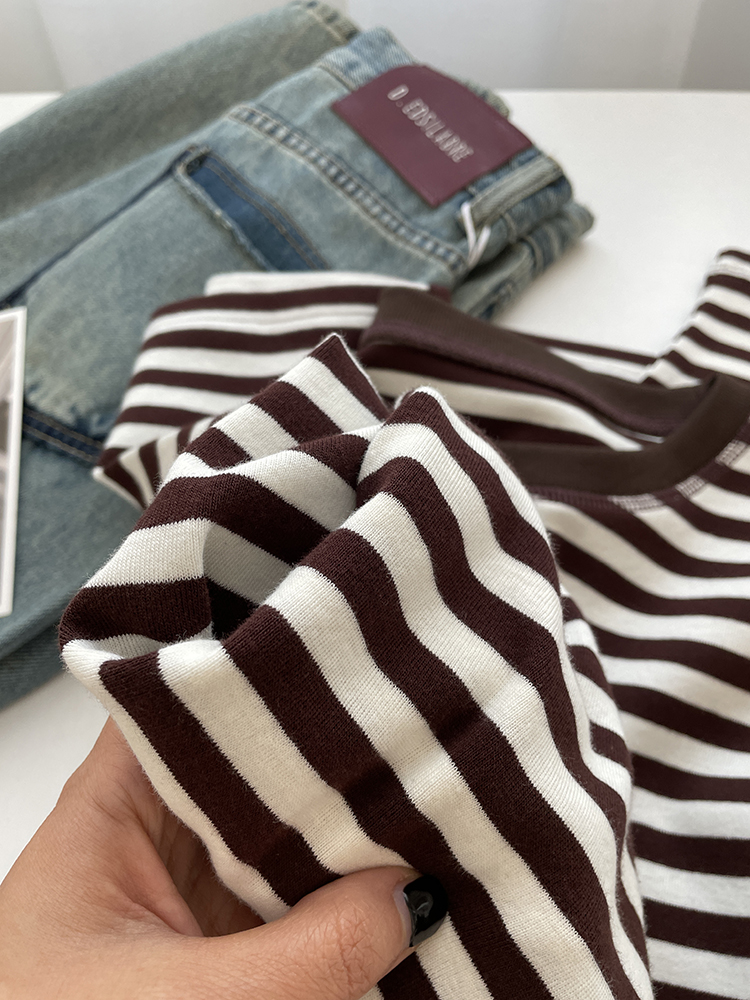 显白咖色条纹明线长袖打底衫女