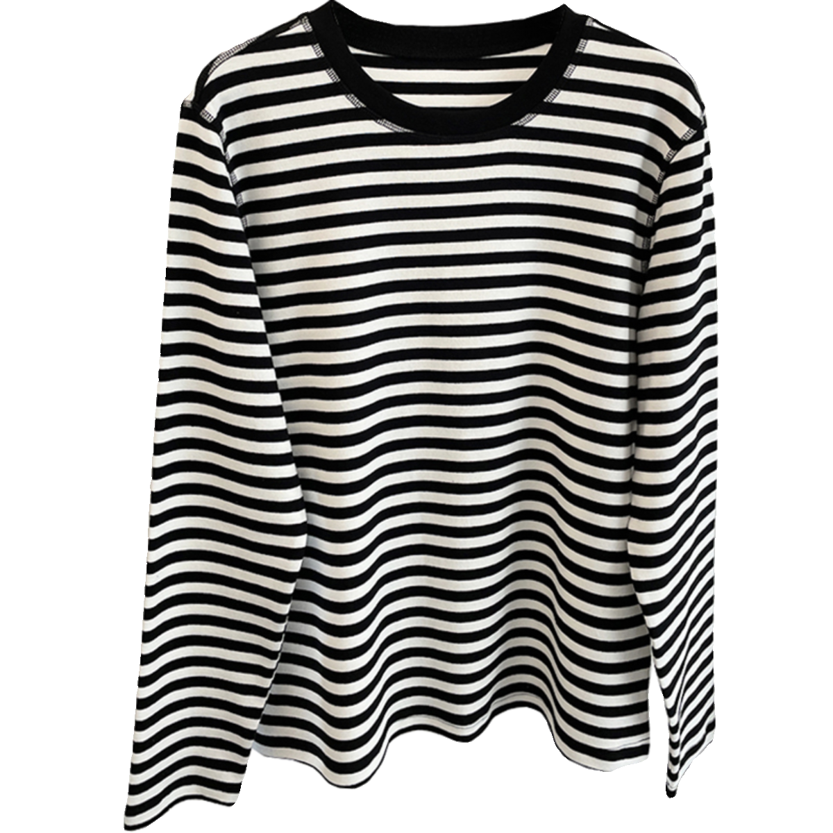 柠波家。显白咖色条纹明线长袖T恤女春秋宽松百搭圆领休闲打底衫