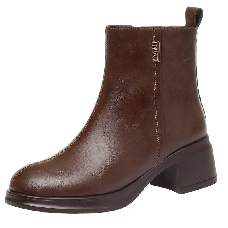 全牛皮短靴女冬中跟加绒羊毛棉靴
