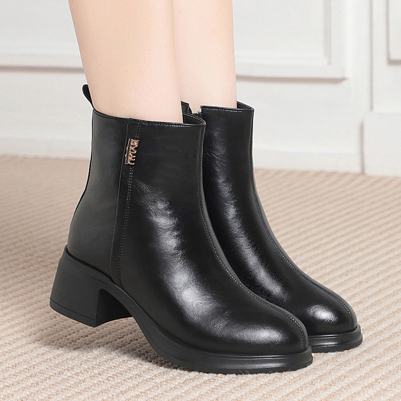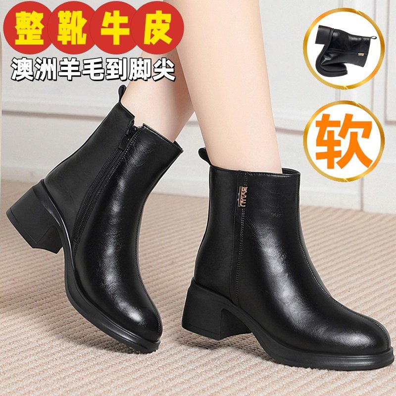 全牛皮真皮短靴女冬中跟加绒加厚羊毛妈妈棉鞋粗跟保暖女棉靴单靴