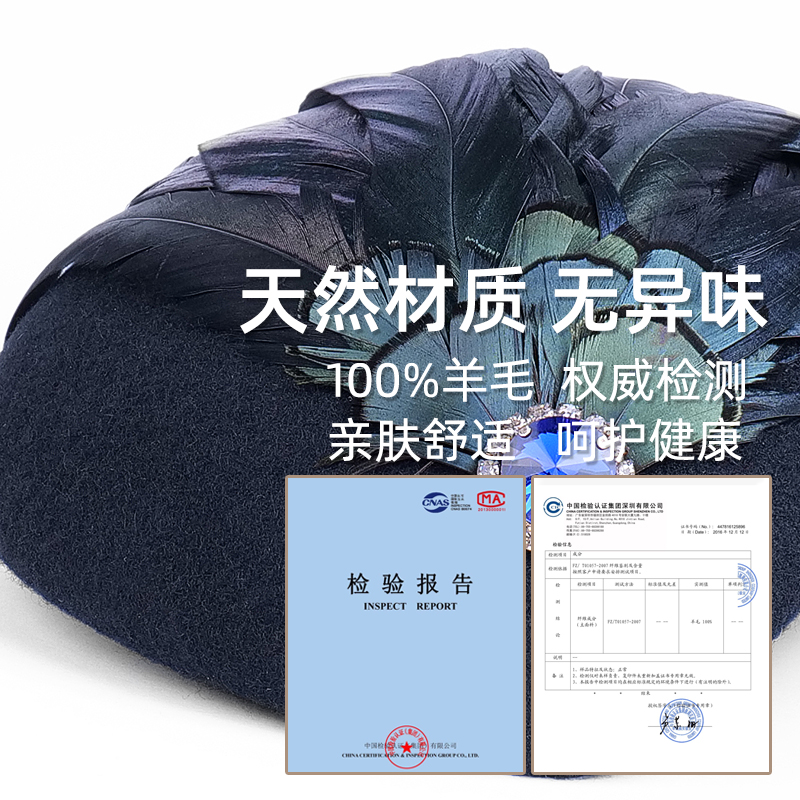 EE 秋冬新款优雅复古纯羊毛帽子天然羽毛装饰毛呢贝雷帽 帽子女冬