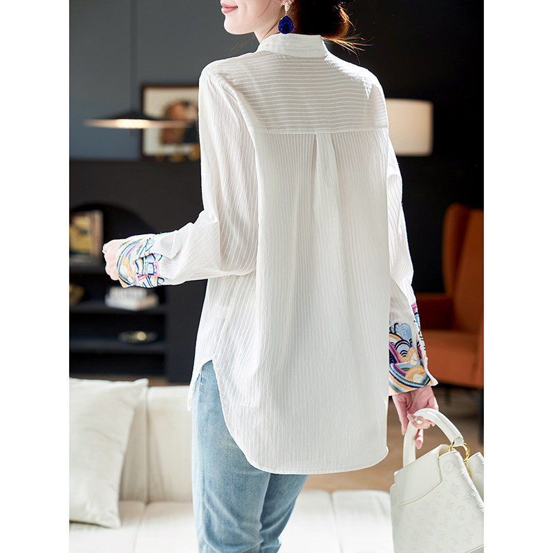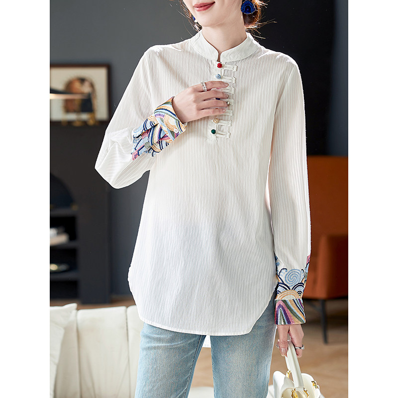 宝诗黎国风条纹刺绣长袖衬衫2026春季新款洋气百搭白色职业衬衣女