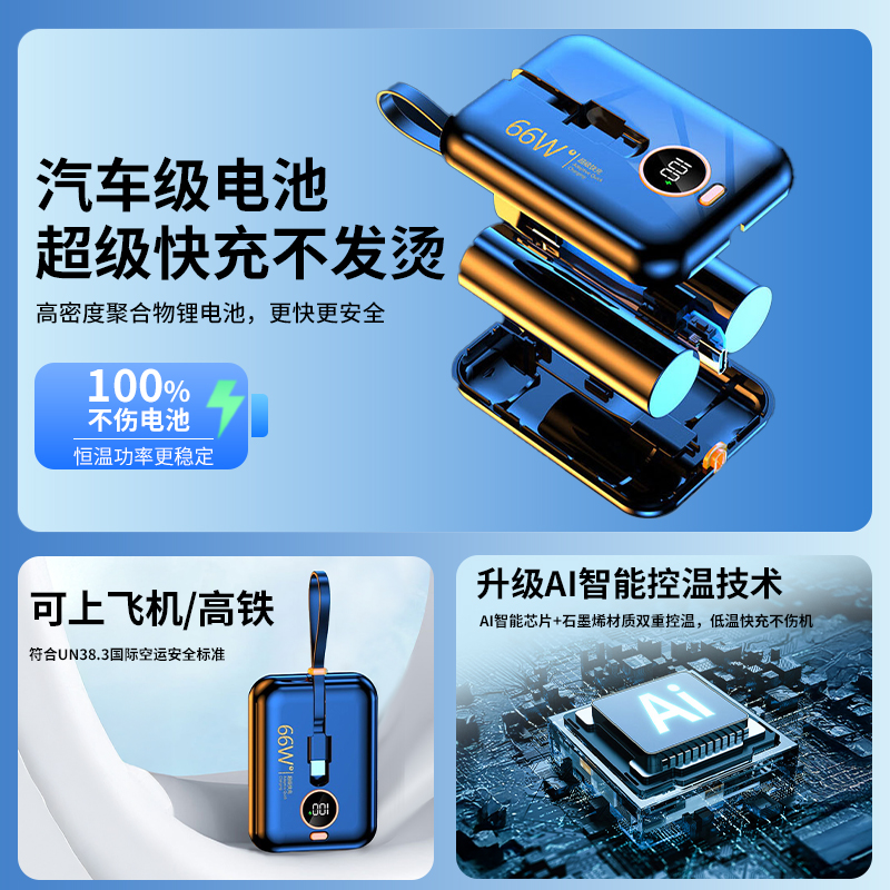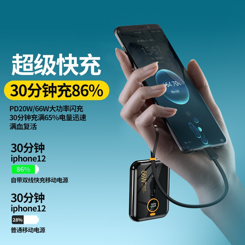 66W超级快充迷你自带线充电宝20000毫安超薄小巧便携移动电源