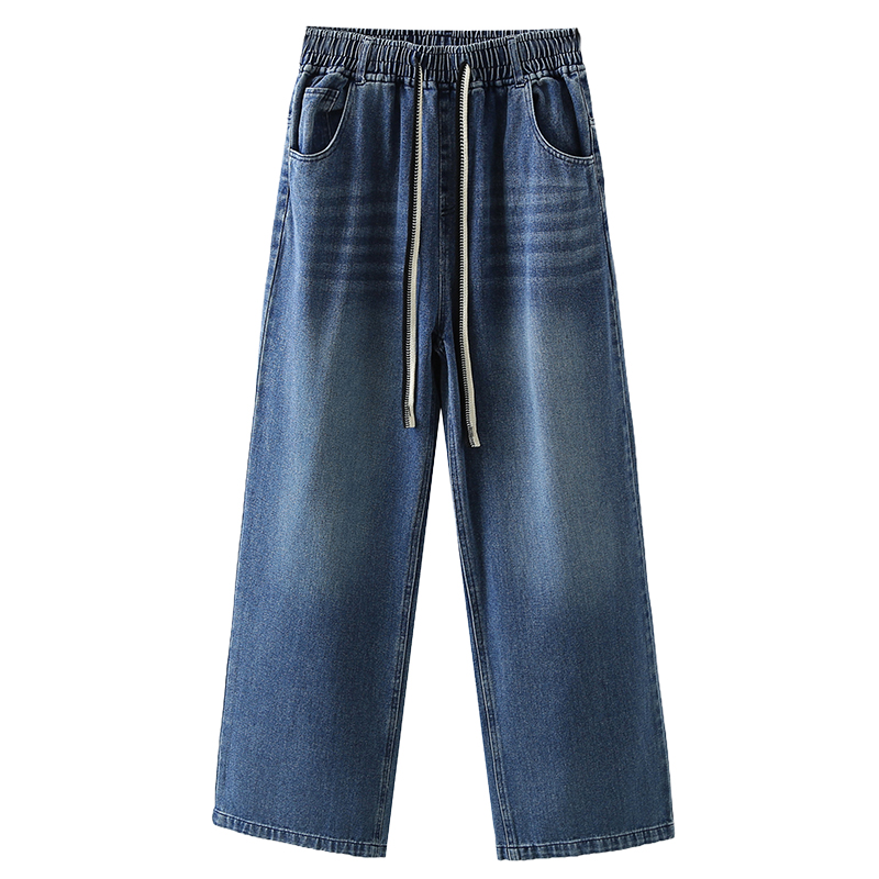大码女装秋季新款宽松胖mm松紧腰抽绳直筒牛仔裤阔腿拖地裤长裤