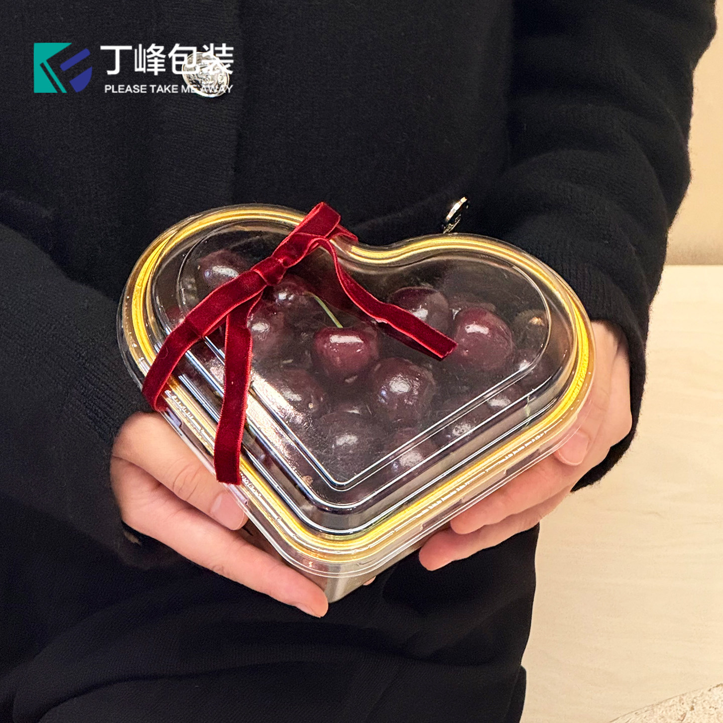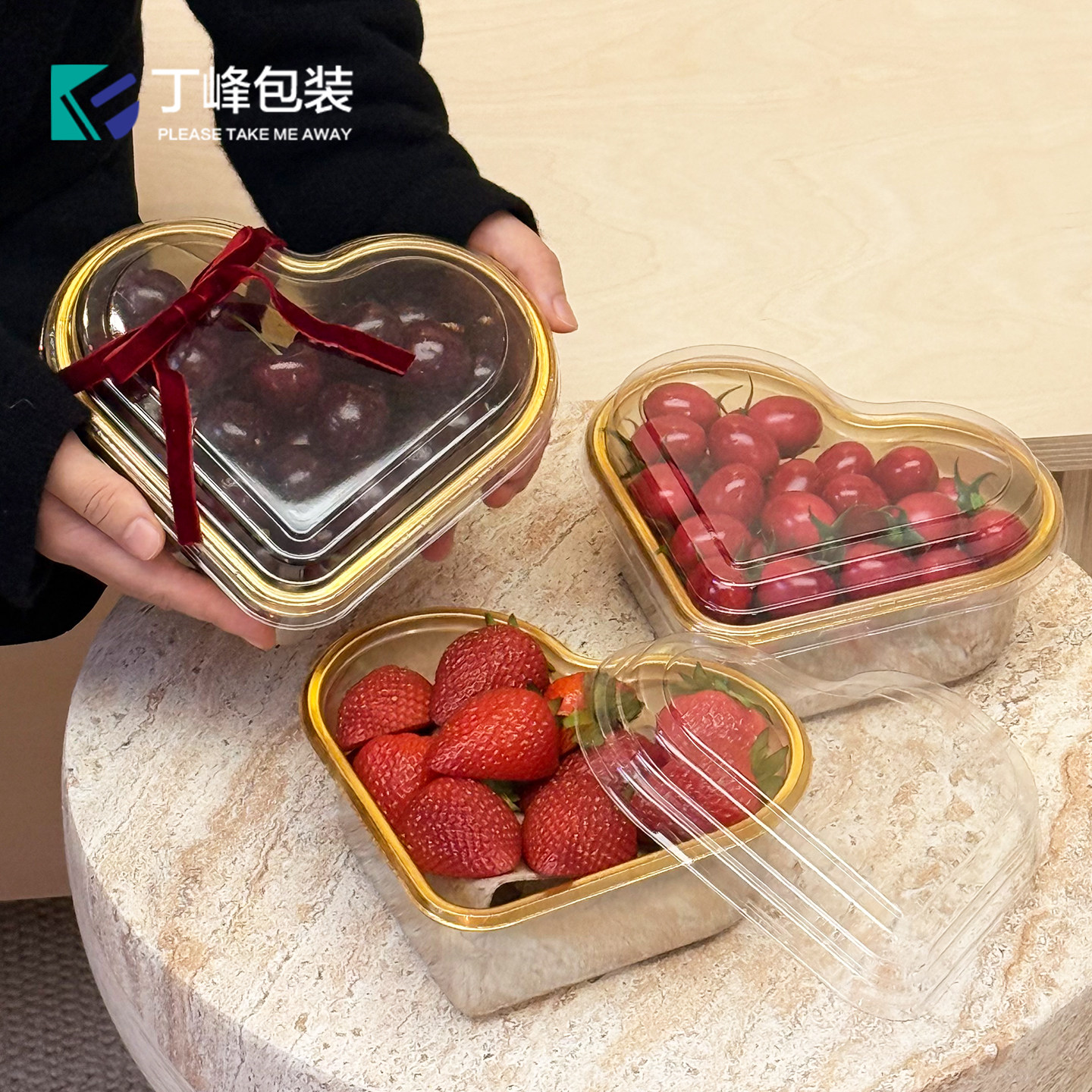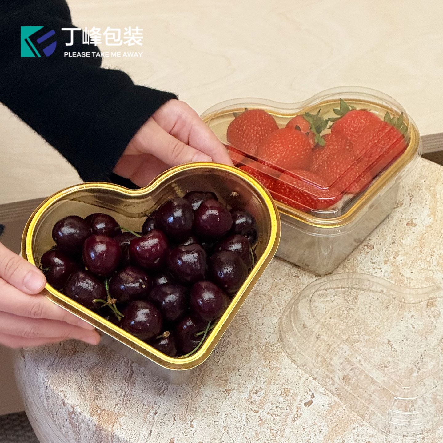 丁峰·心形深金底果切塑料盒车厘子/草莓网红果切打包盒含透明盖