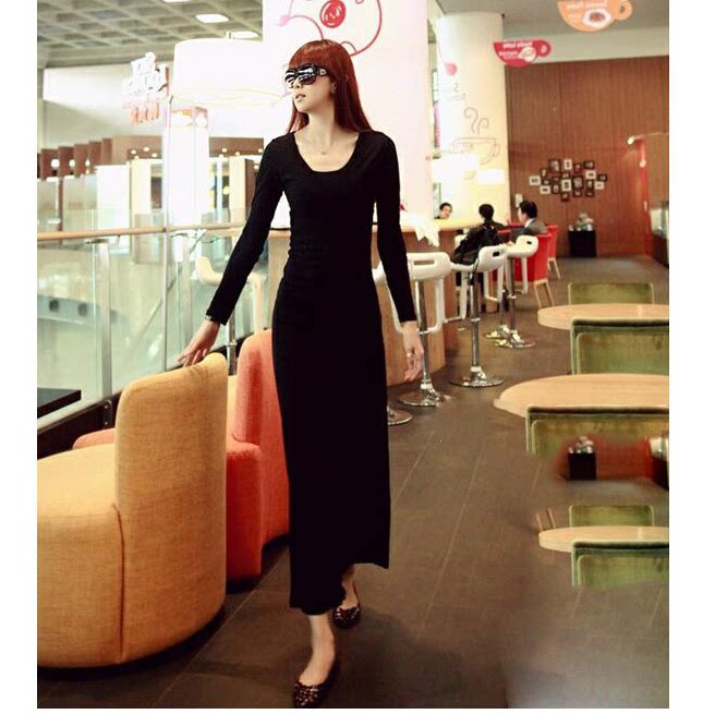 春秋莫代尔长袖连衣裙女修身显瘦打底裙大码包臀裙长裙圆领A字裙