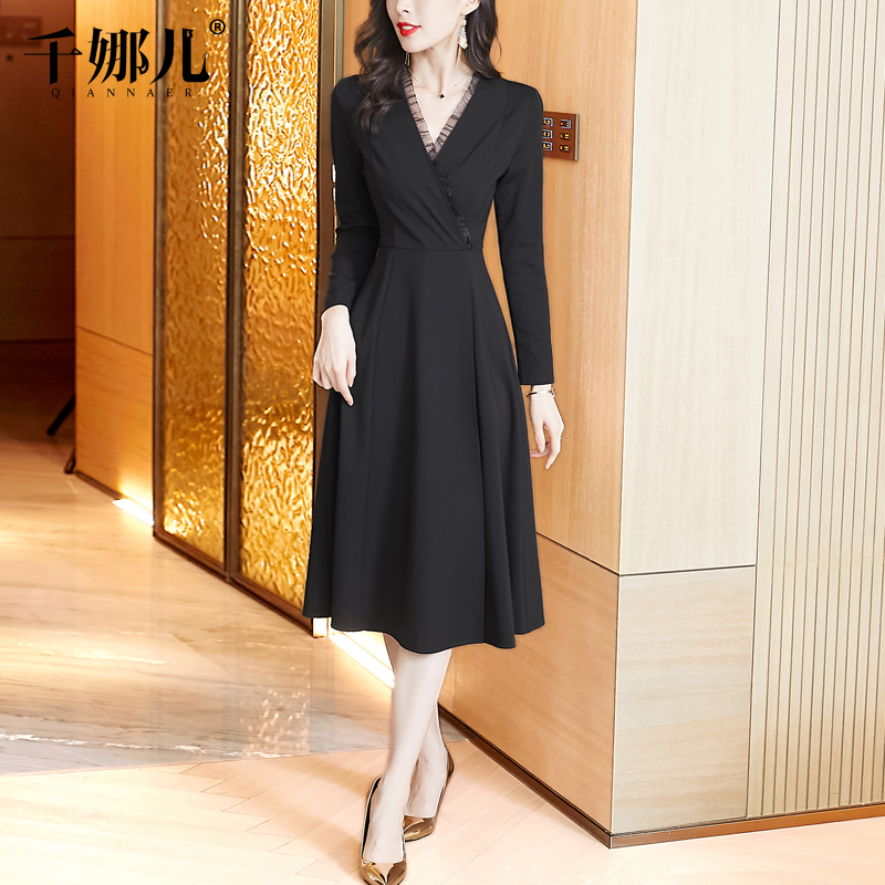 黑色长裙冬装2025新款连衣裙长款V领收腰显瘦气质A字赫本风小黑裙