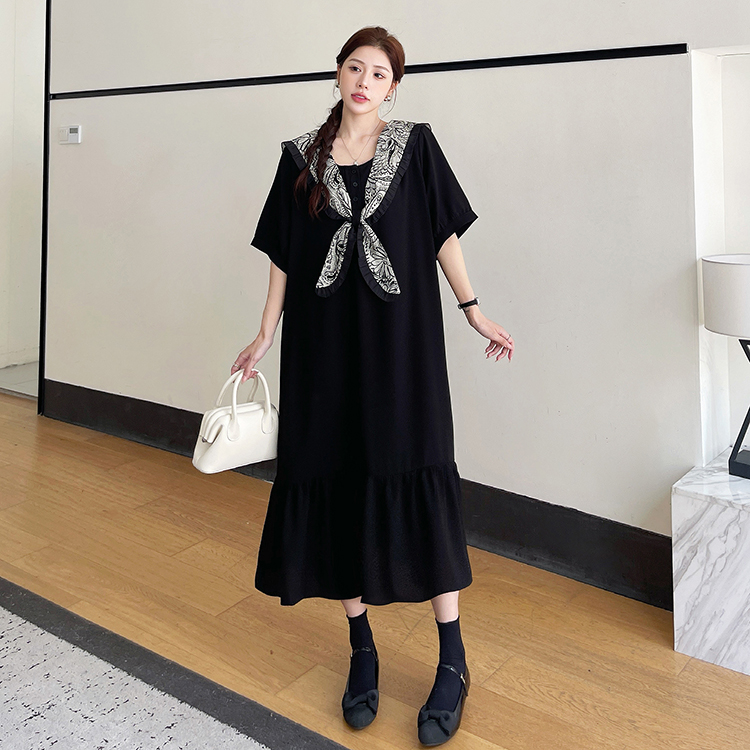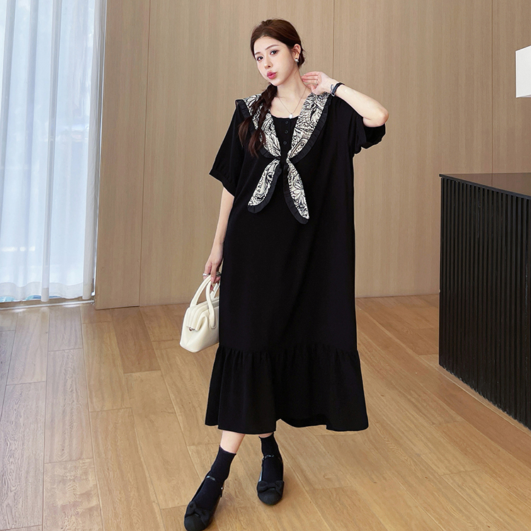 夏季大码女装胖mm显瘦遮肚法式碎花海军领拼接连衣裙过膝鱼尾长裙