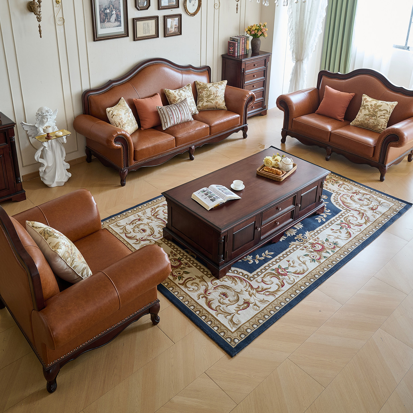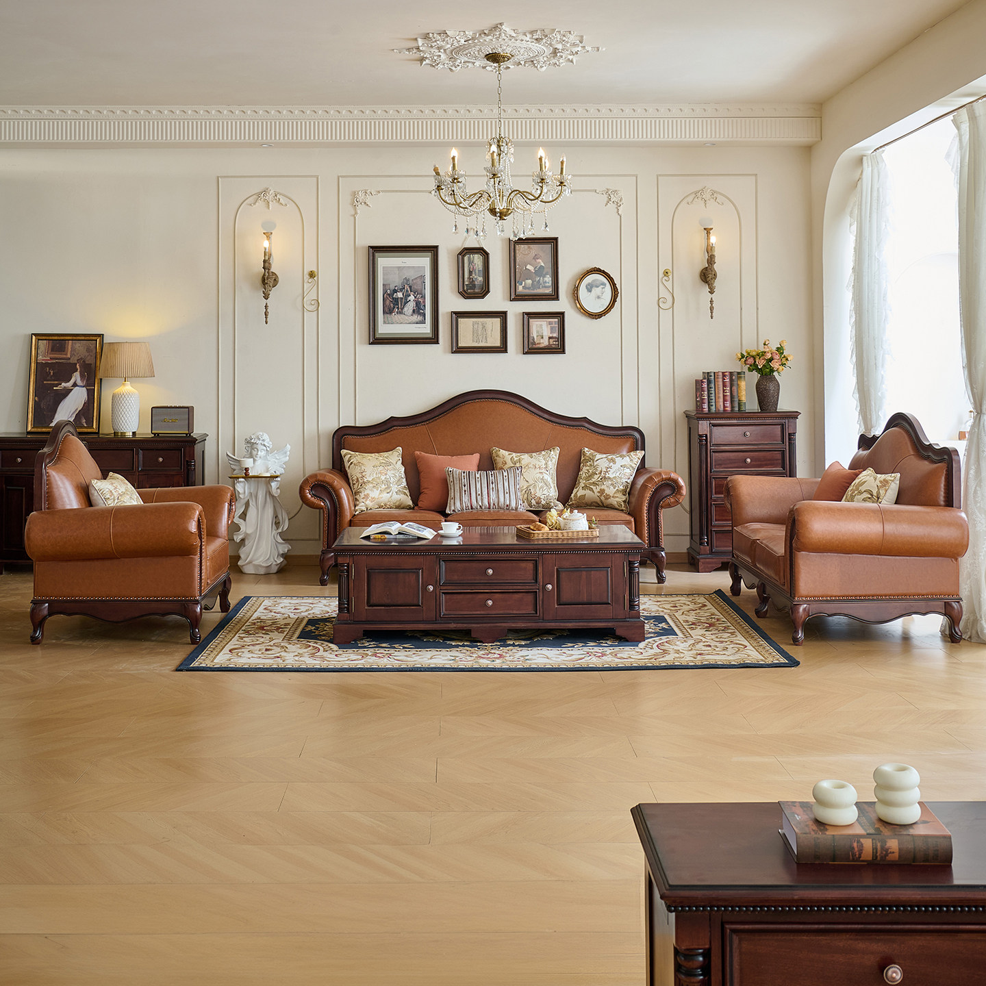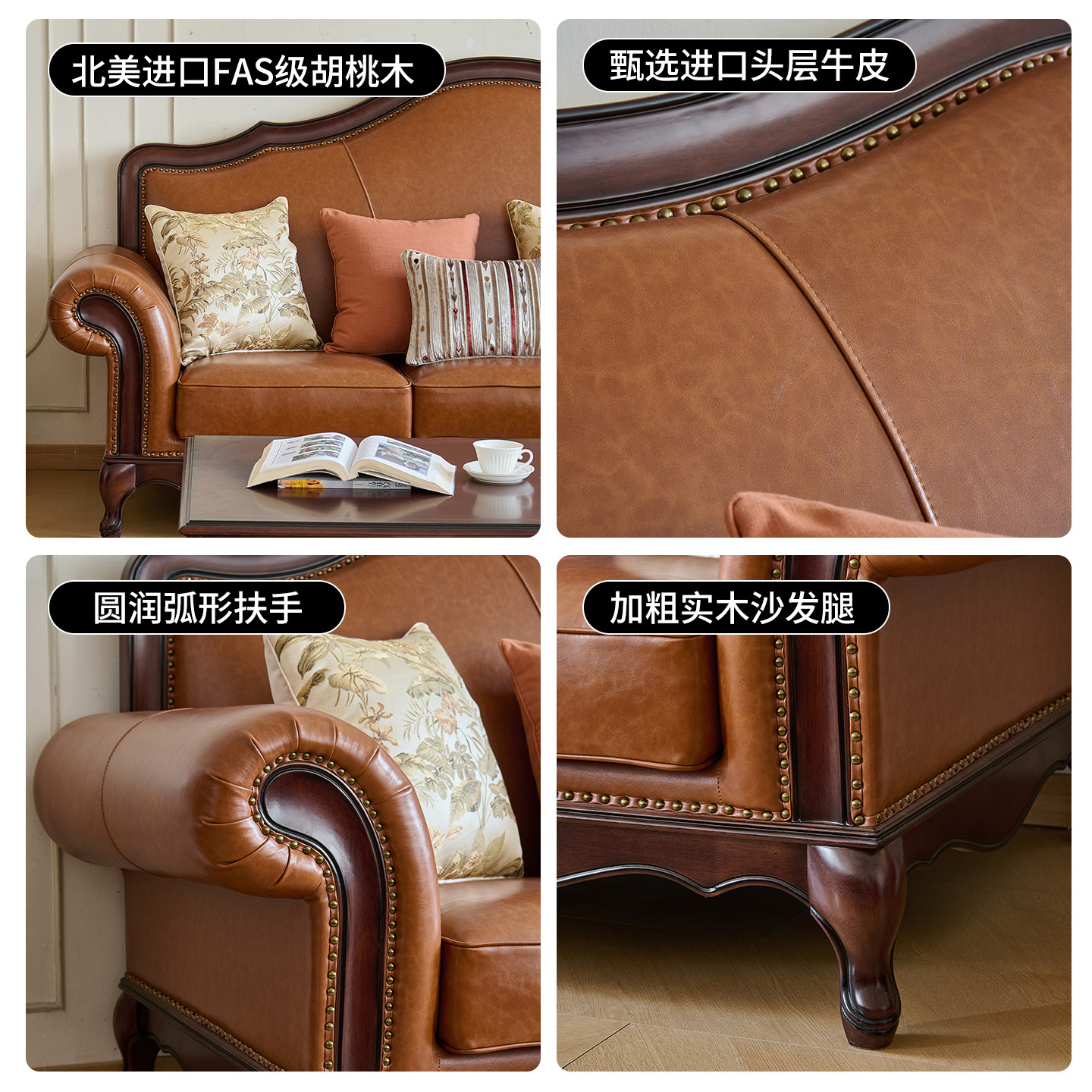 美式复古全实木沙发胡桃木真皮中古风客厅家具套装卡座沙发