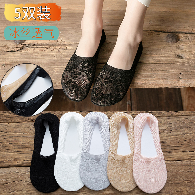 冰丝绣花船袜女浅口隐形棉底袜子夏季薄款蕾丝短袜硅胶防滑深口袜