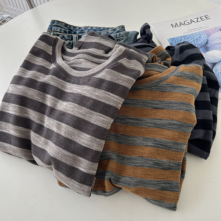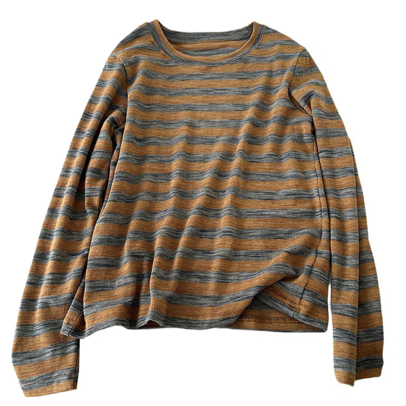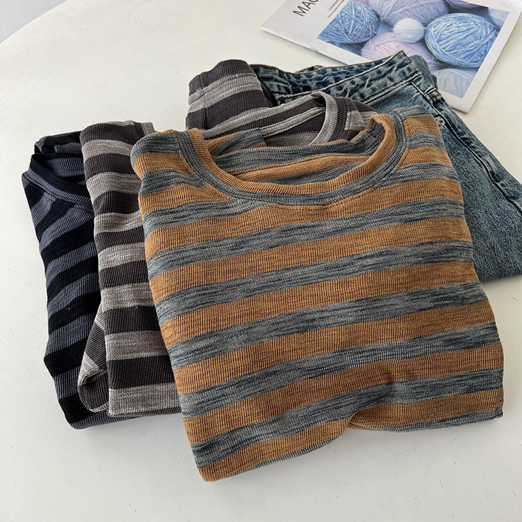 复古撞色条纹长袖T恤女秋季新款宽松显瘦百搭圆领上衣休闲针织衫