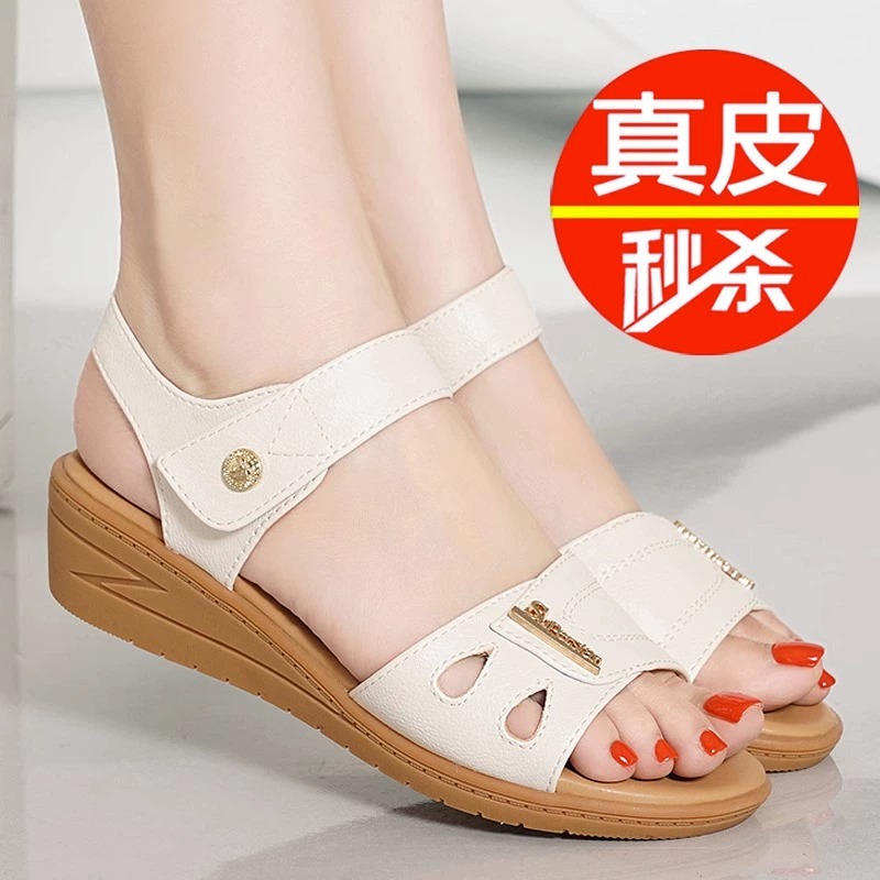 断码品牌鞋真皮牛筋底坡跟凉鞋女夏外穿软底时尚舒适平底妈妈鞋子