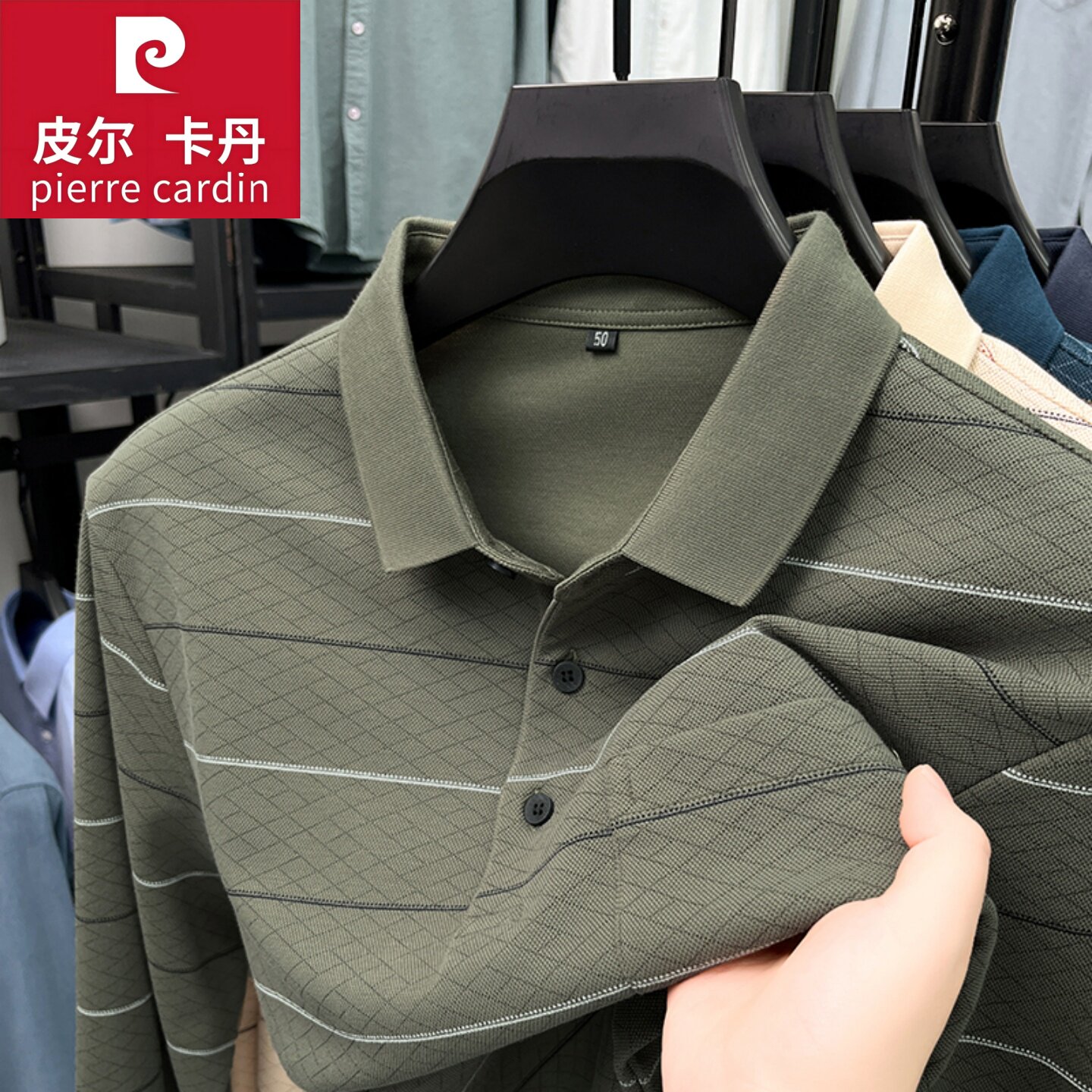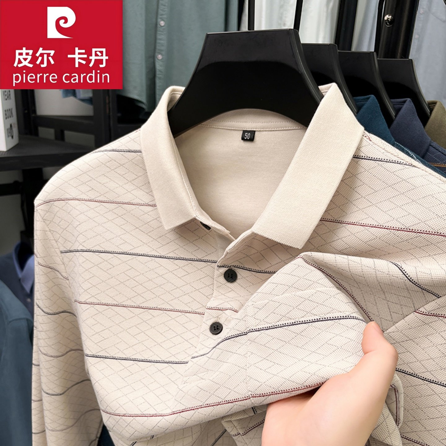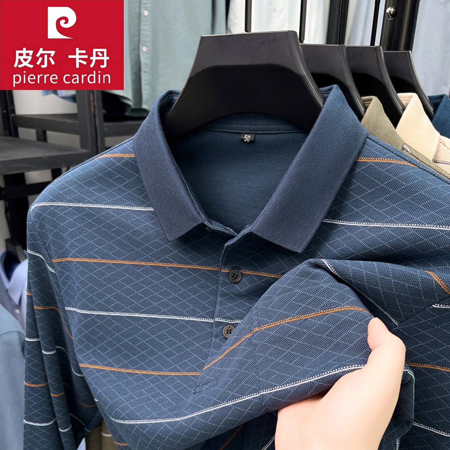 皮尔卡丹男士长袖T恤春秋季高端品牌条纹Polo衫翻领中年爸爸打底