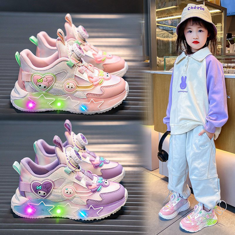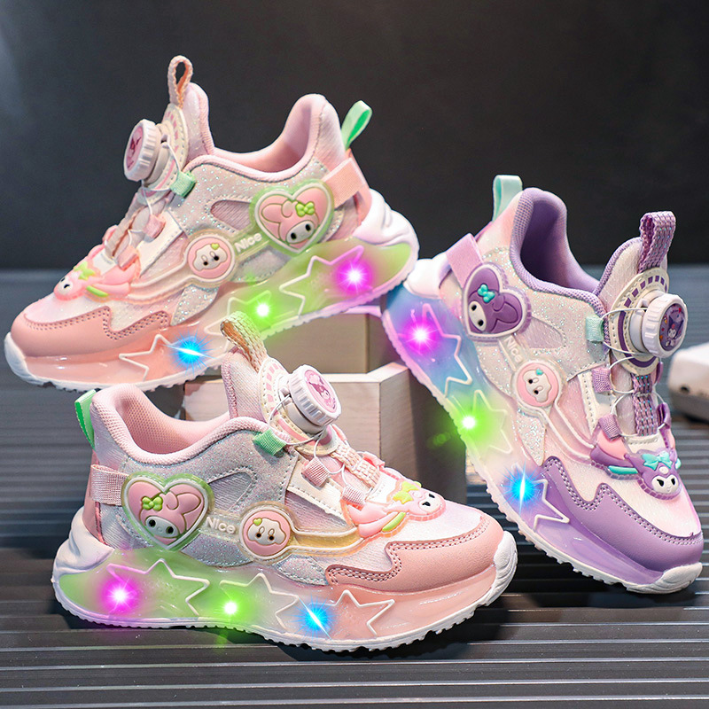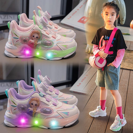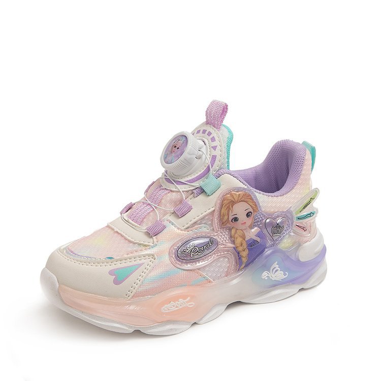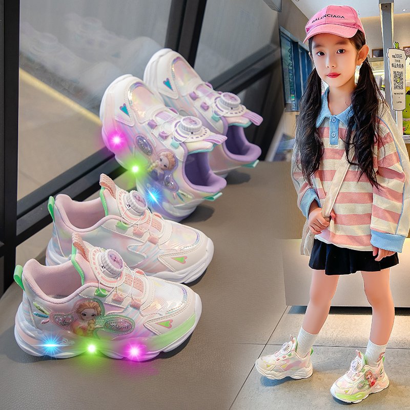 儿童带灯运动鞋2025春秋新款旋转纽扣卡通发光公主鞋女童跑步网鞋