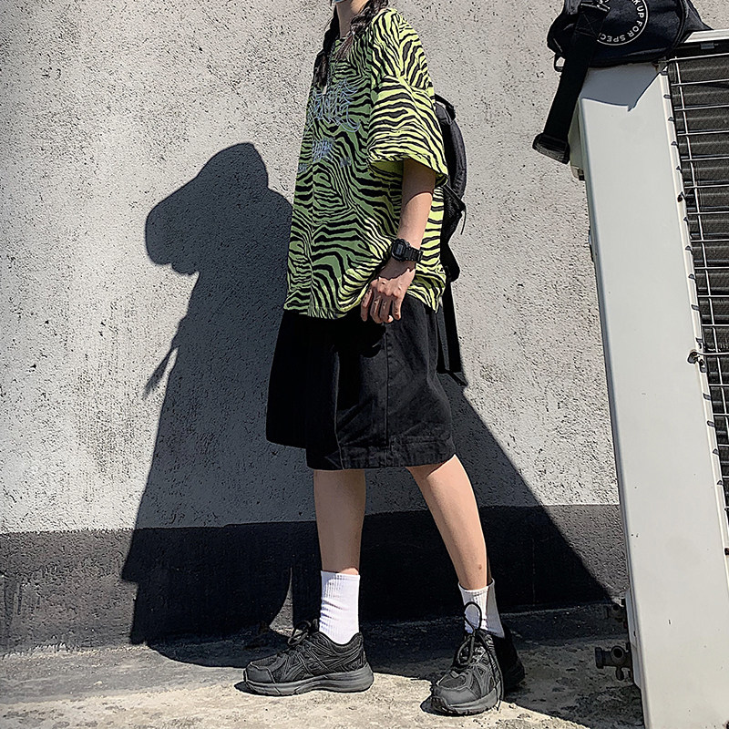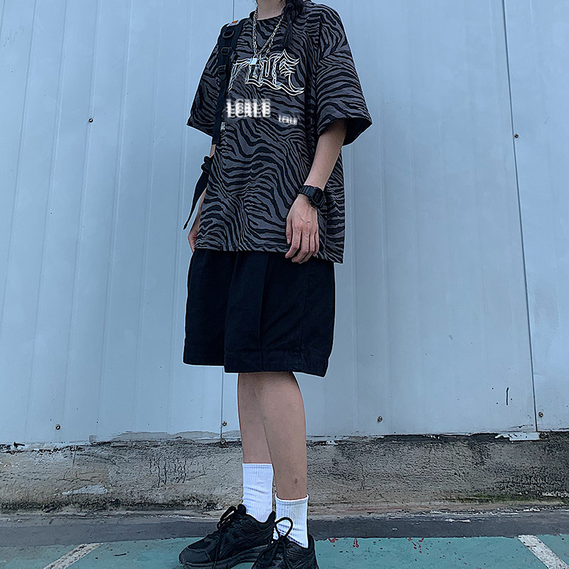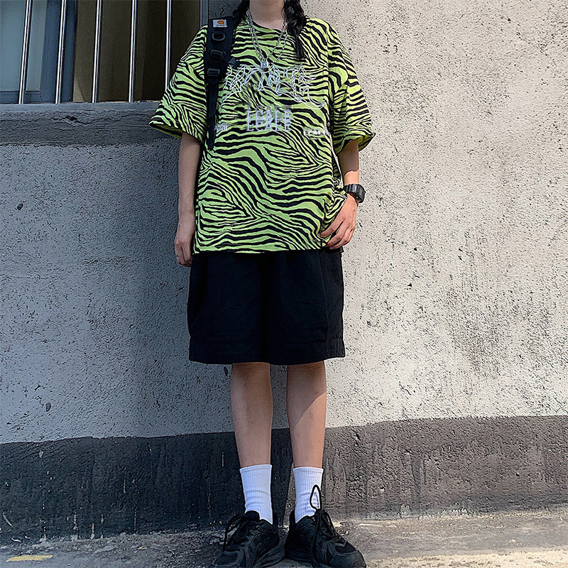 韩国INS夏季复古圆领豹纹条纹宽松t恤短袖男女半袖潮流个性嘻哈款