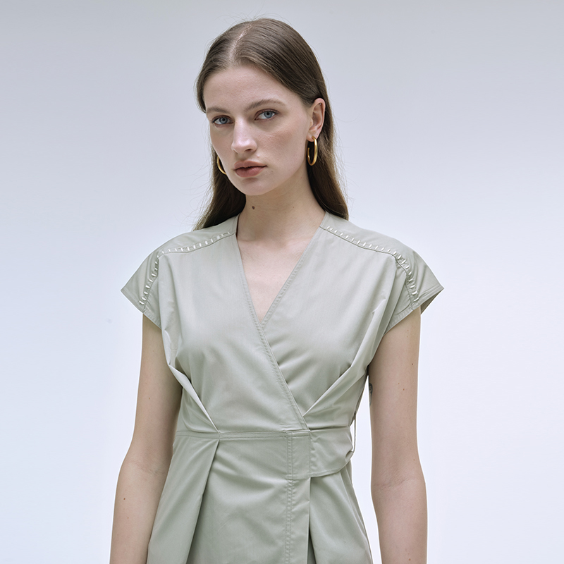 INSPIRE STORIES 春夏款裹裙绿色V领系带女士连衣裙银泰