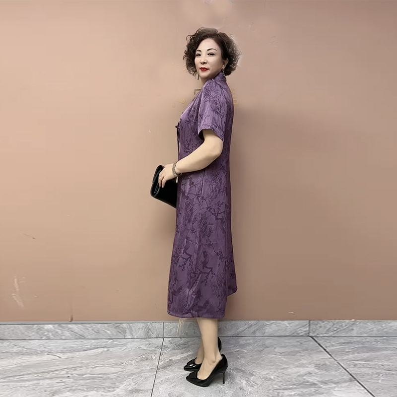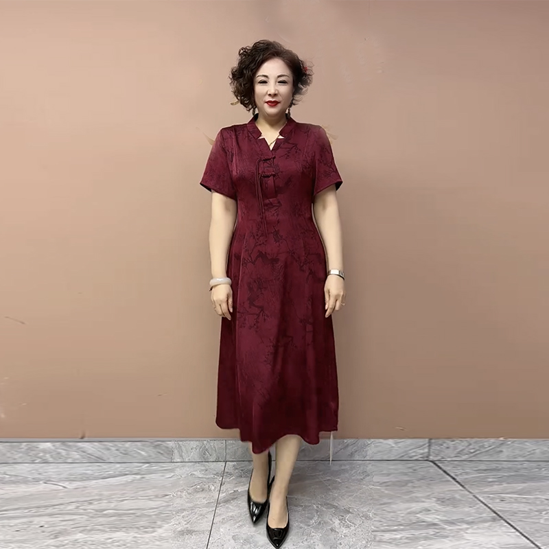 新中式国风真丝旗袍连衣裙夏季新款贵夫人妈妈装V领短袖收腰长裙