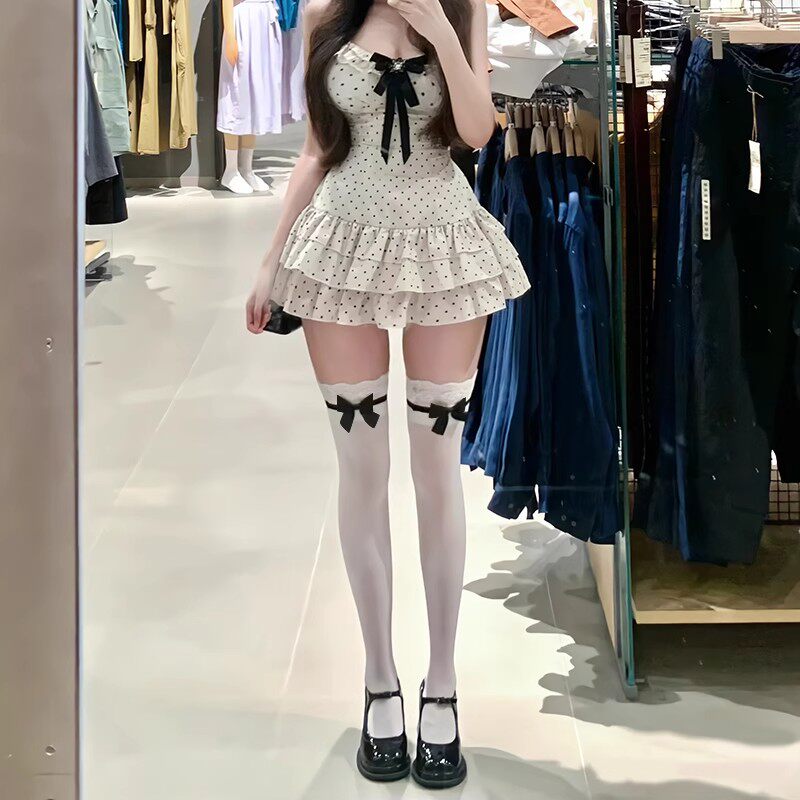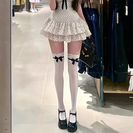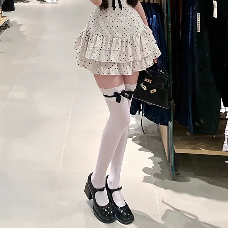 lolita蕾丝花边高筒蝴蝶结大腿袜丝袜天鹅绒白色过膝长筒袜女廋腿