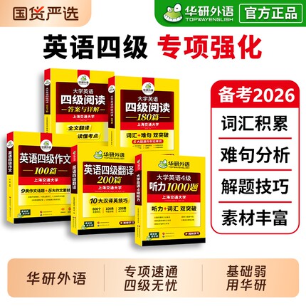 华研外语英语四级强化专项训练书全套学习资料备考2026年6月大学英语四六级阅读理解听力翻译与写作文历年考试真题词汇单词cet46