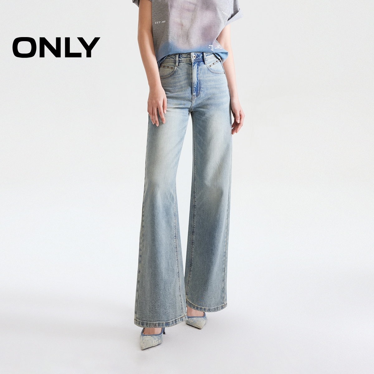 ONLY2025秋季新款显瘦通勤磨白精致铆钉小个子长裤直筒裤牛仔裤女