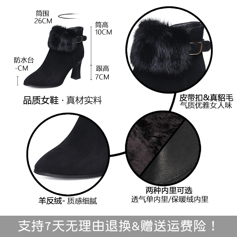 2025新款冬季水貂毛高跟短靴女粗跟磨砂真皮鞋加绒棉鞋羊皮女靴子