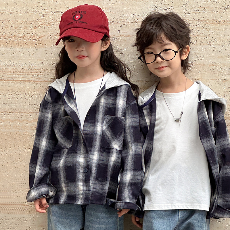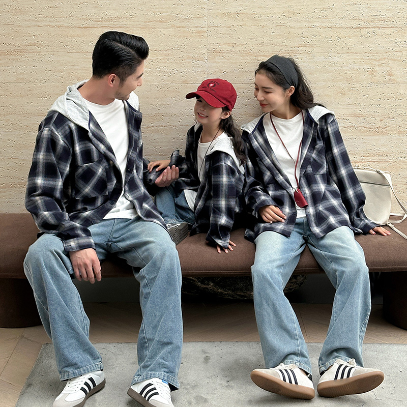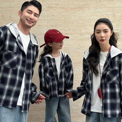 炸街亲子装春装衬衫一家三口全家装连帽长袖母子母女装格子外套潮