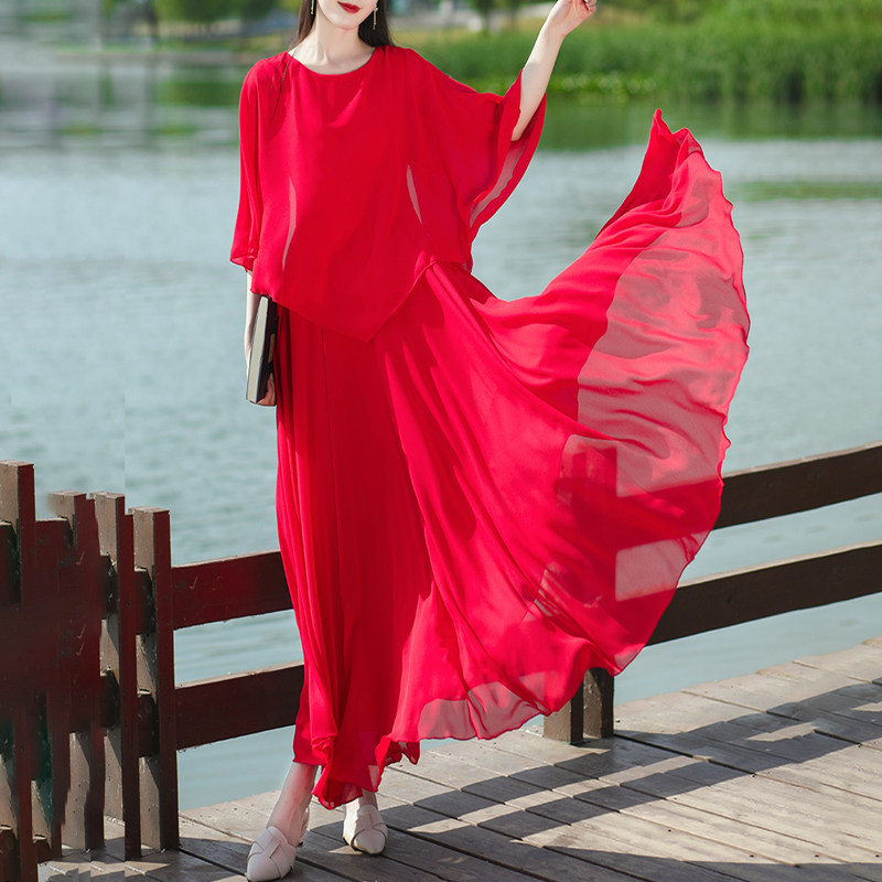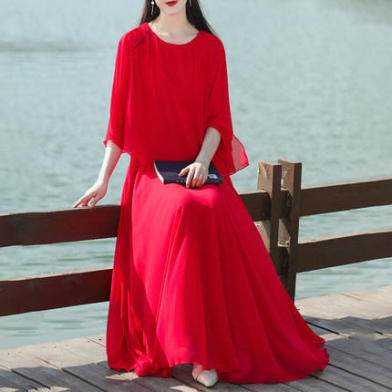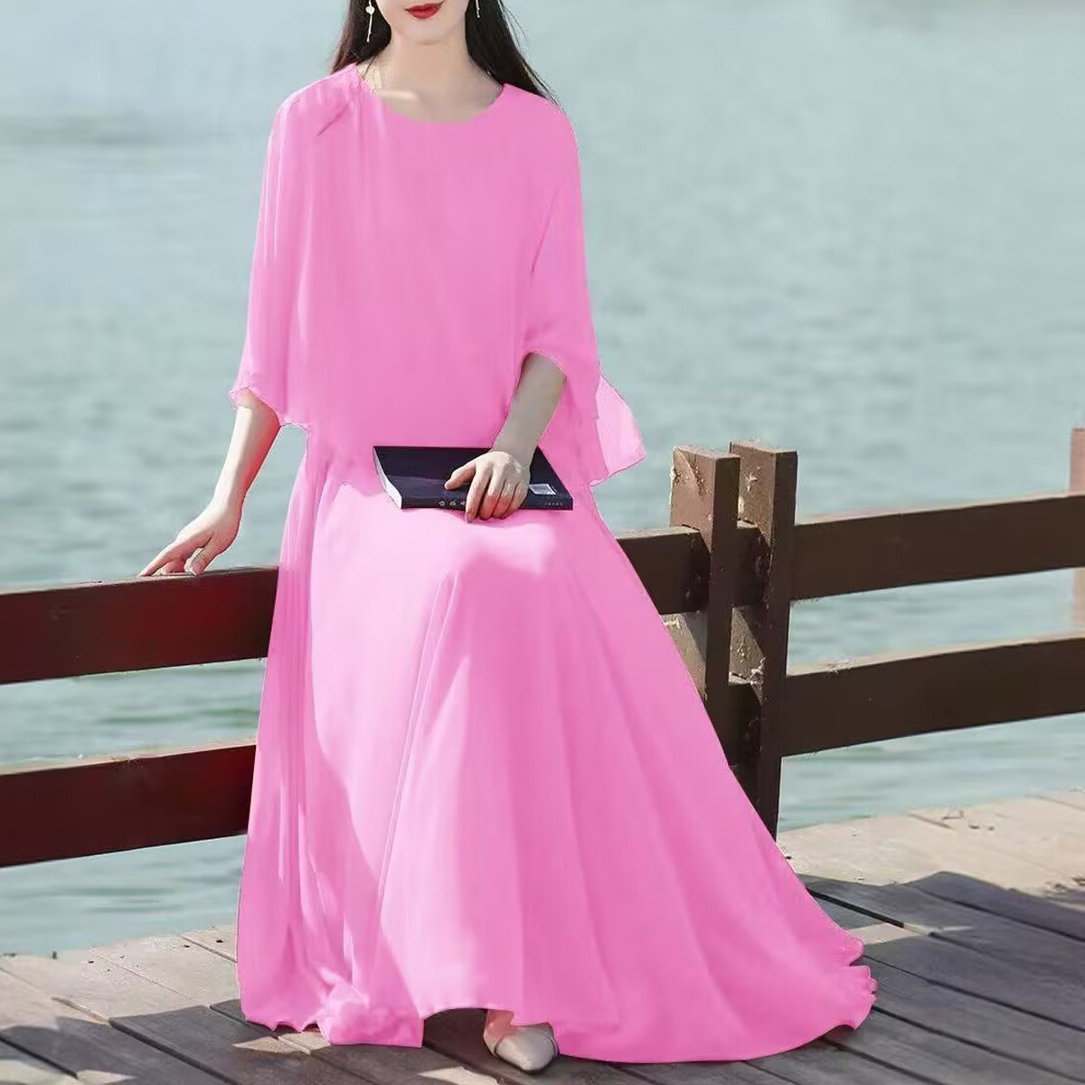 夏新款国风时尚气质圆领假两件真丝桑蚕丝连衣裙旅游拍照大摆长裙
