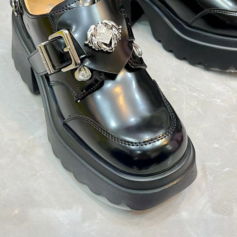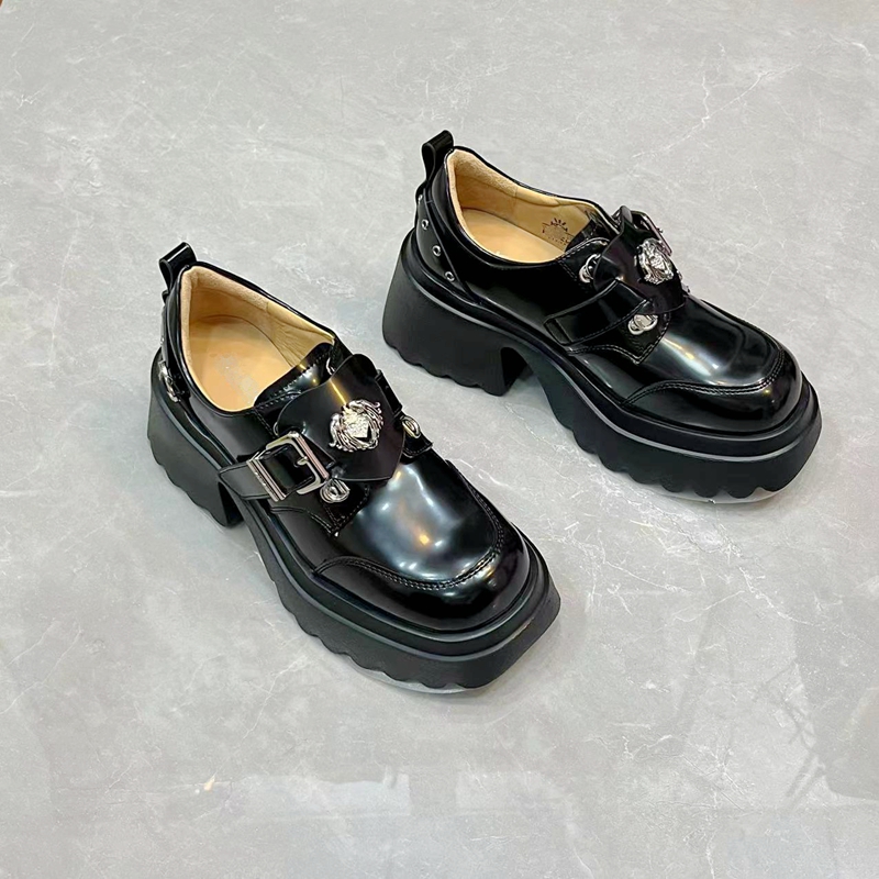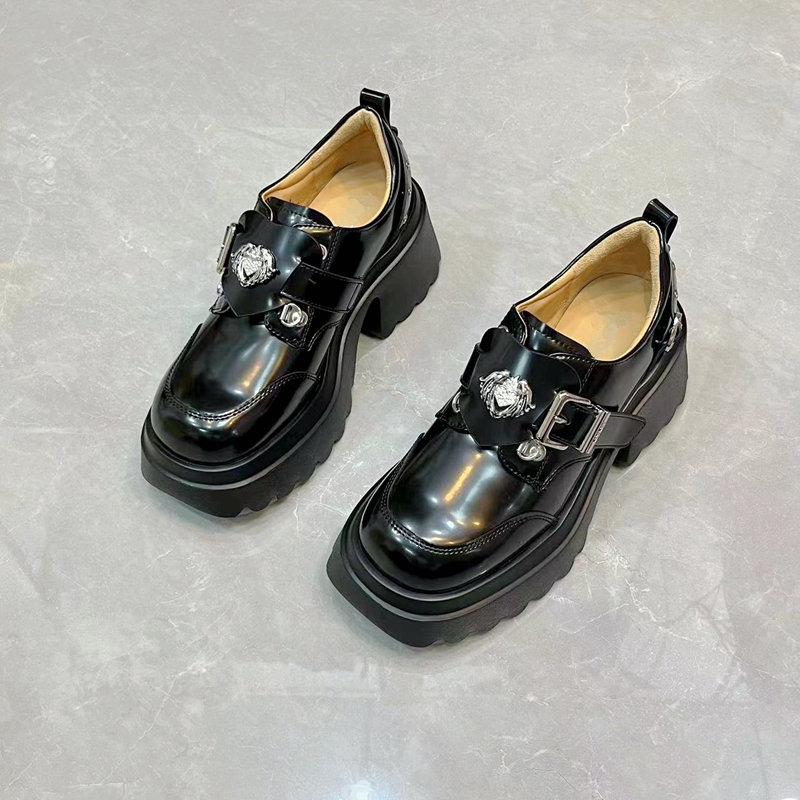 欧洲站真皮圆头魔术贴深口单鞋女厚跟增高皮带扣帅气小皮鞋