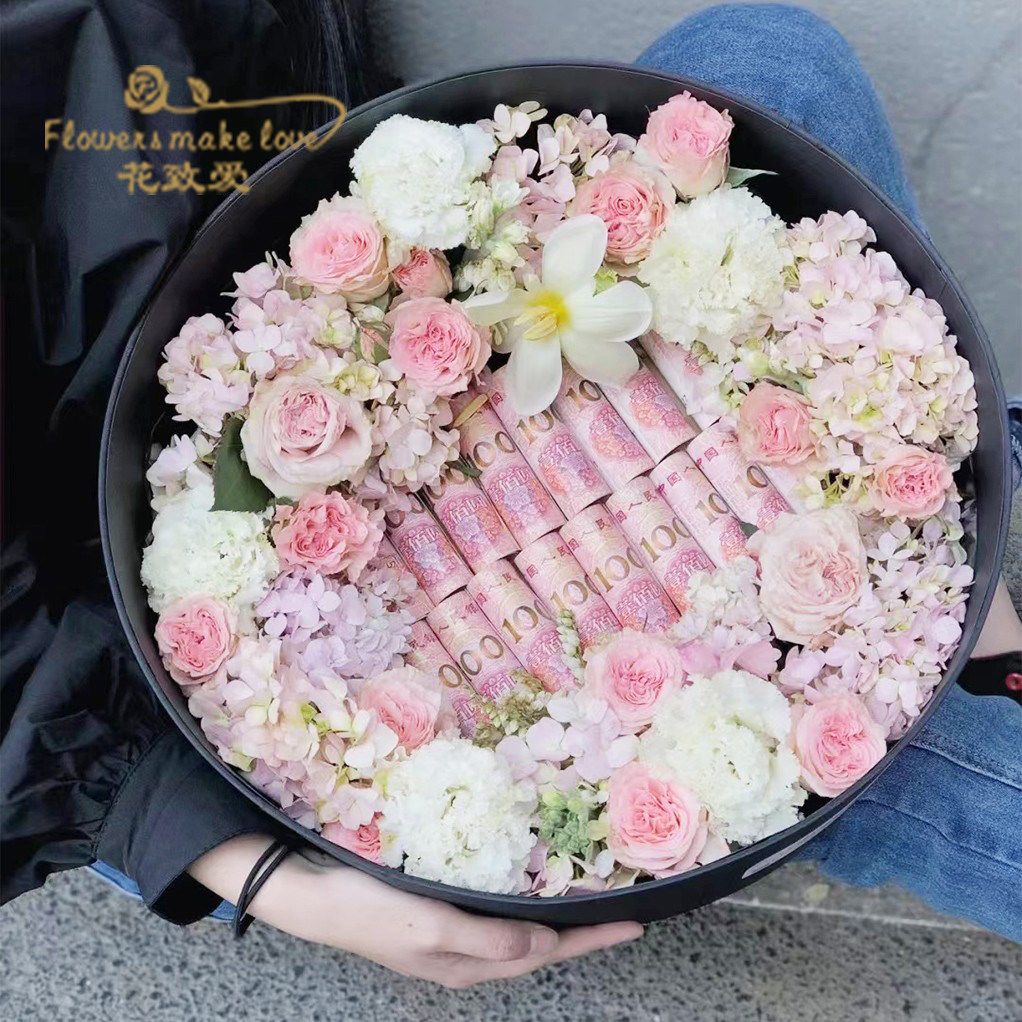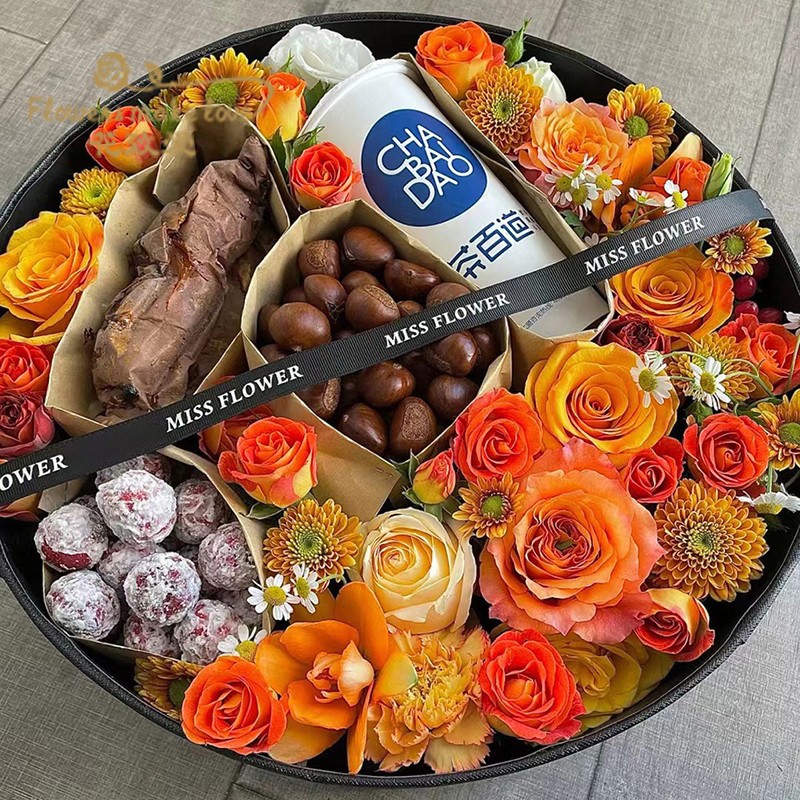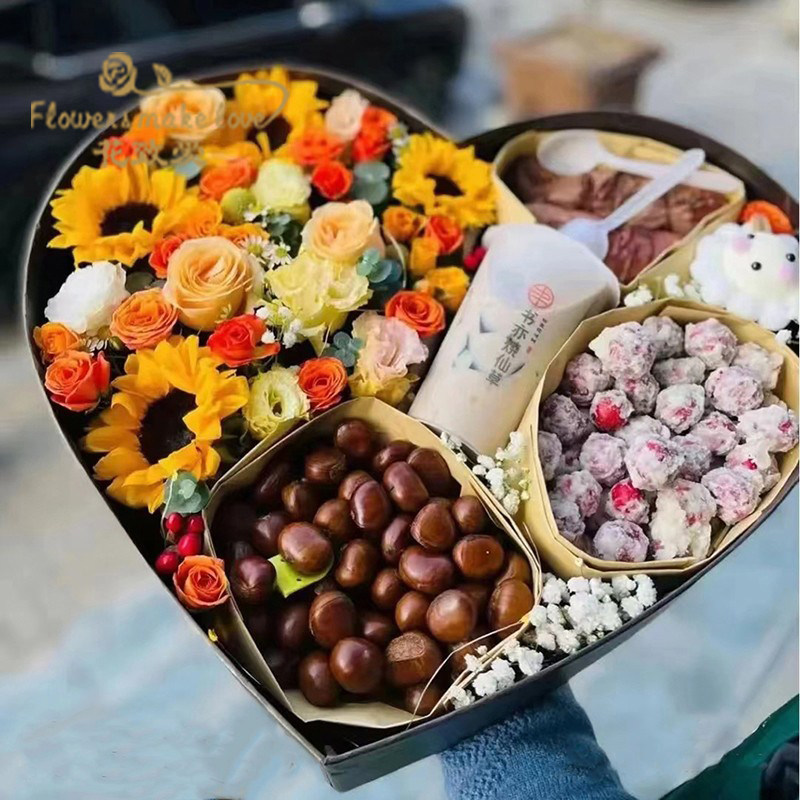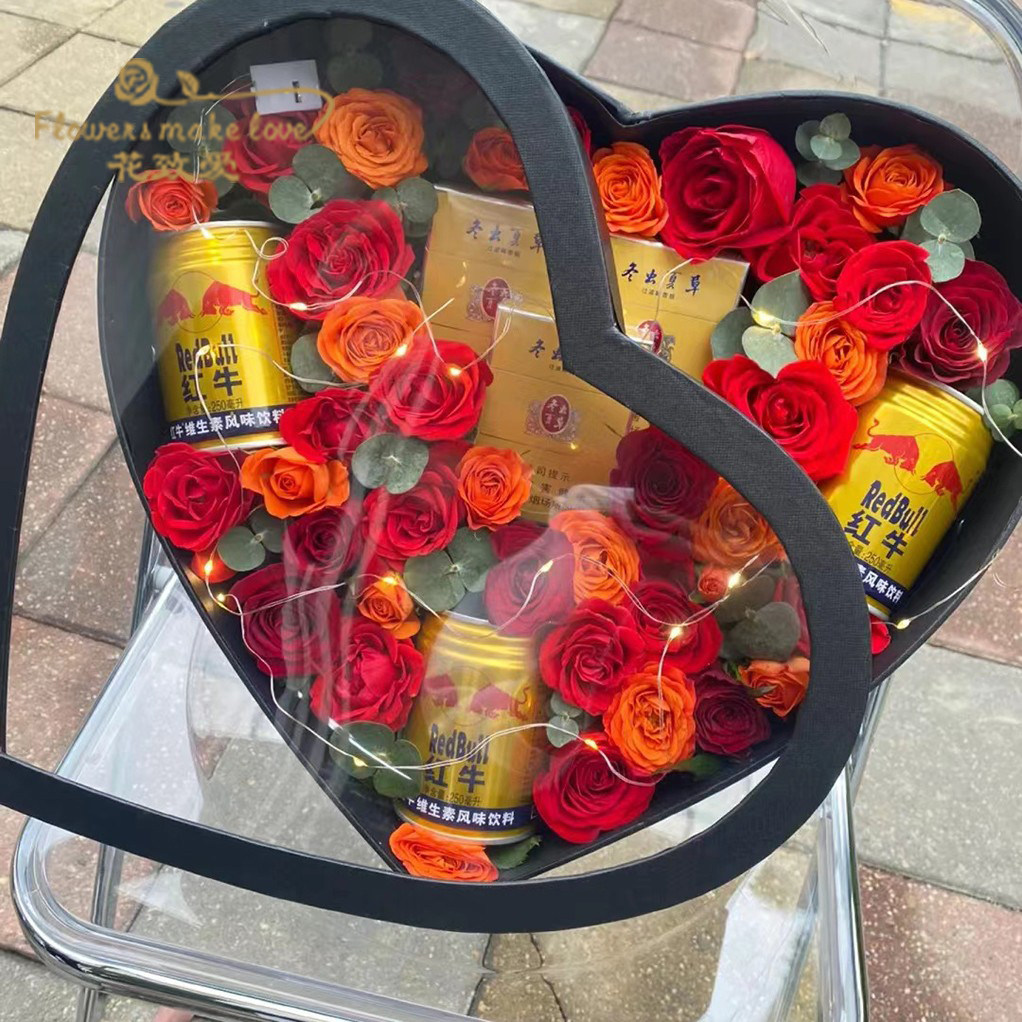 大号鲜花水果礼盒 冬季四件套奶茶香烟红牛花盒 圆形心形透明开窗