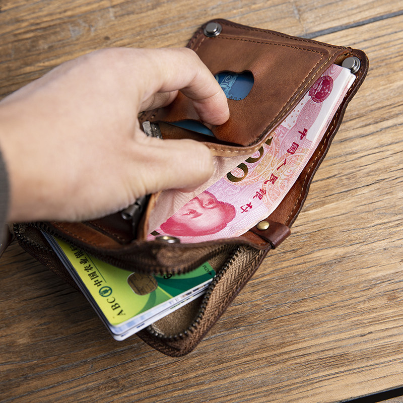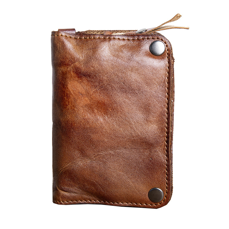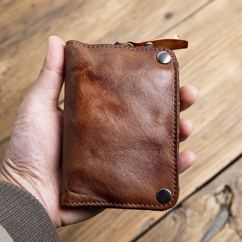 手工复古钱包男真皮小众设计潮牌钥匙包竖款高级感纯牛皮创意银包