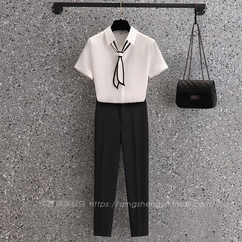 白色衬衫女2023新款短袖夏V领上衣雪纺领带衬衣女士修身职业套装