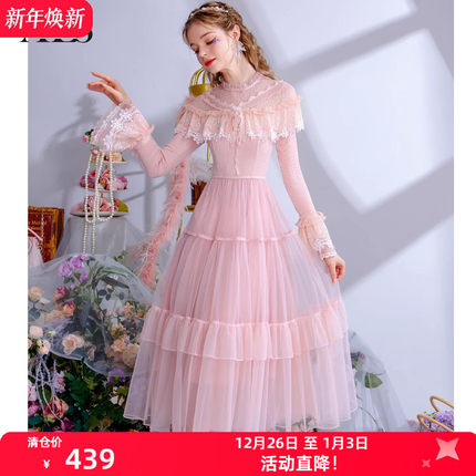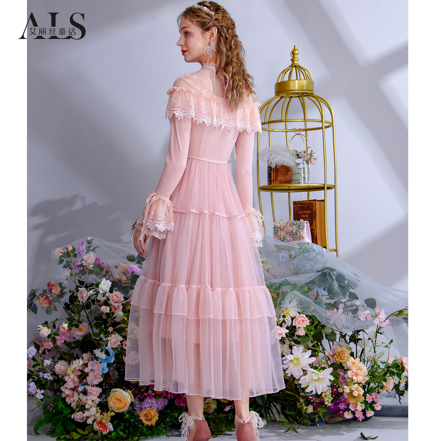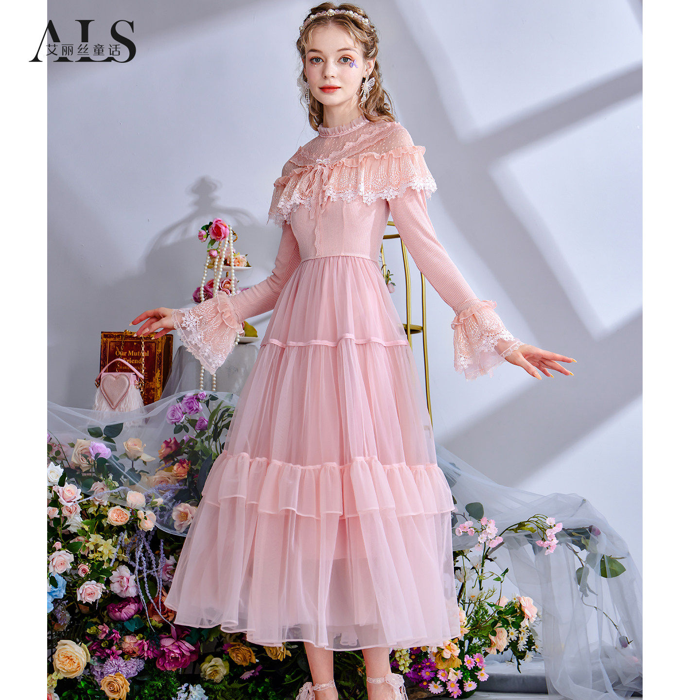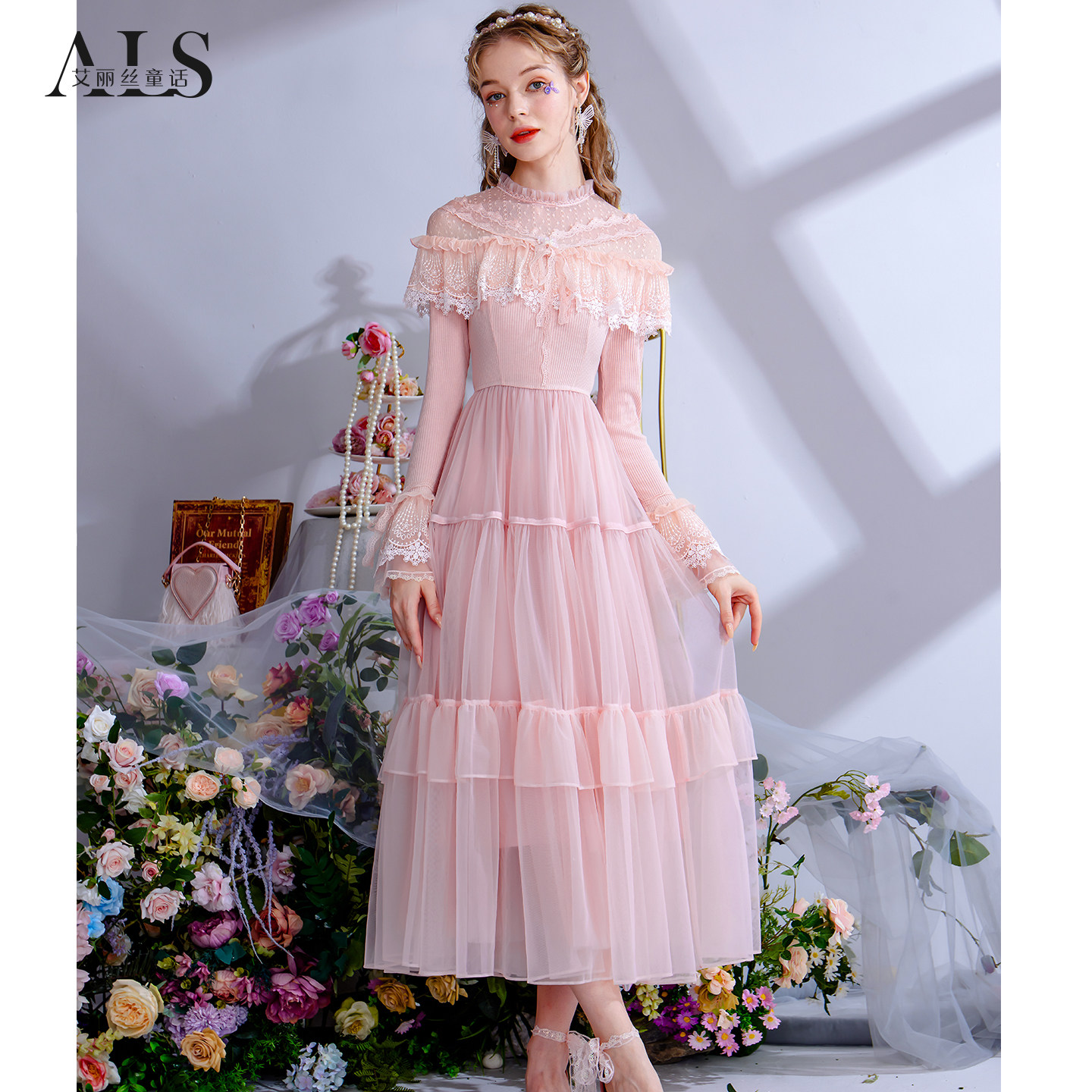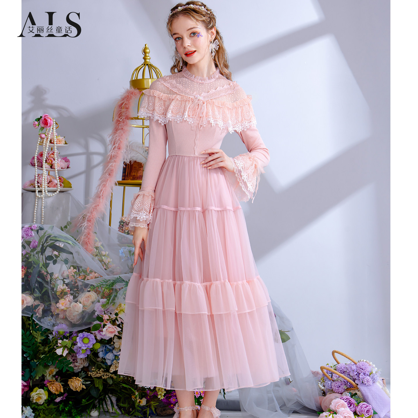 艾丽丝2025秋冬新款粉色气质优雅中长款针织毛衫连衣裙女仙气裙子