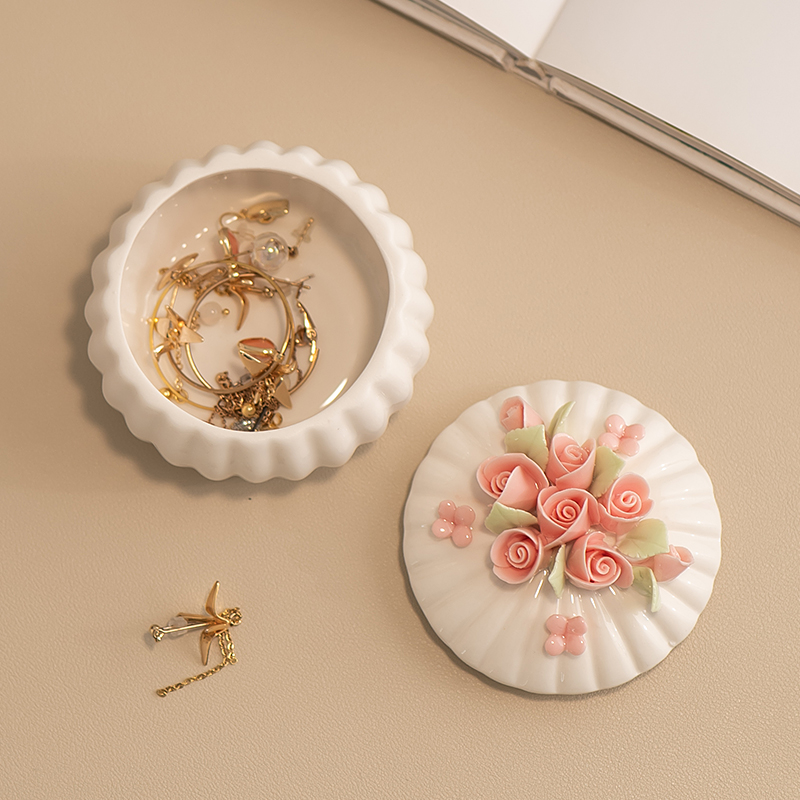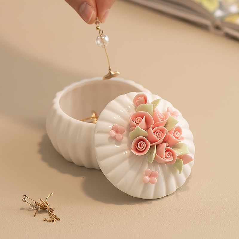 丰白陶瓷手捏花饰品盒粉色玫瑰收纳盒戒指项链耳环桌面梳妆台摆件