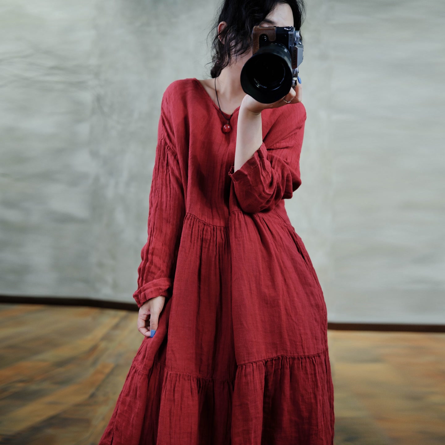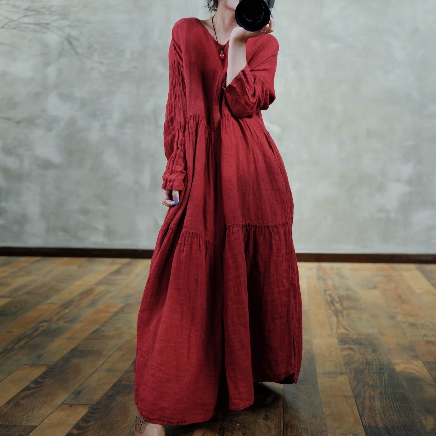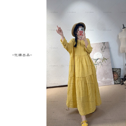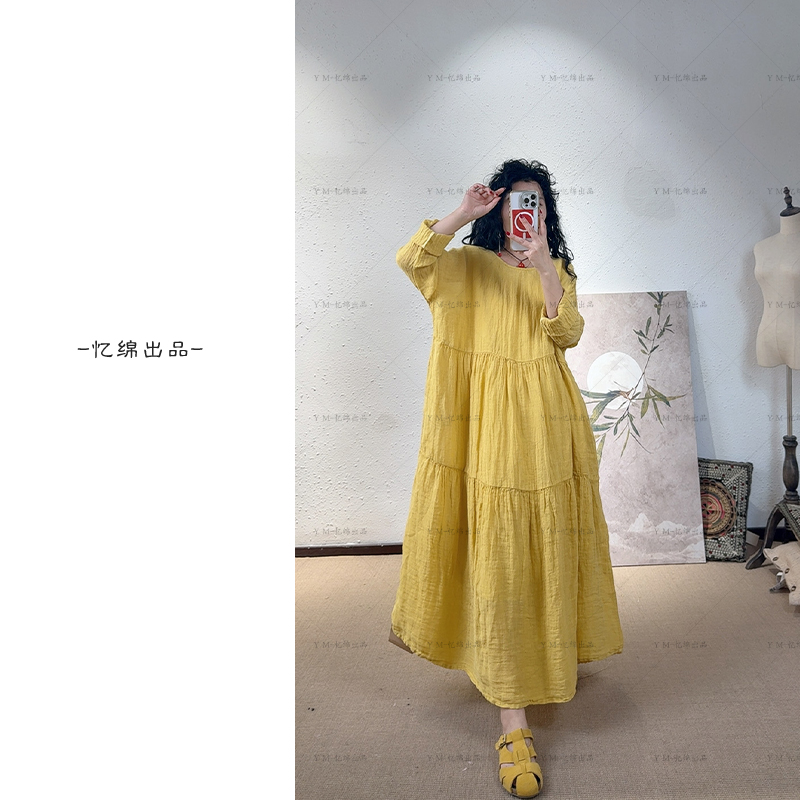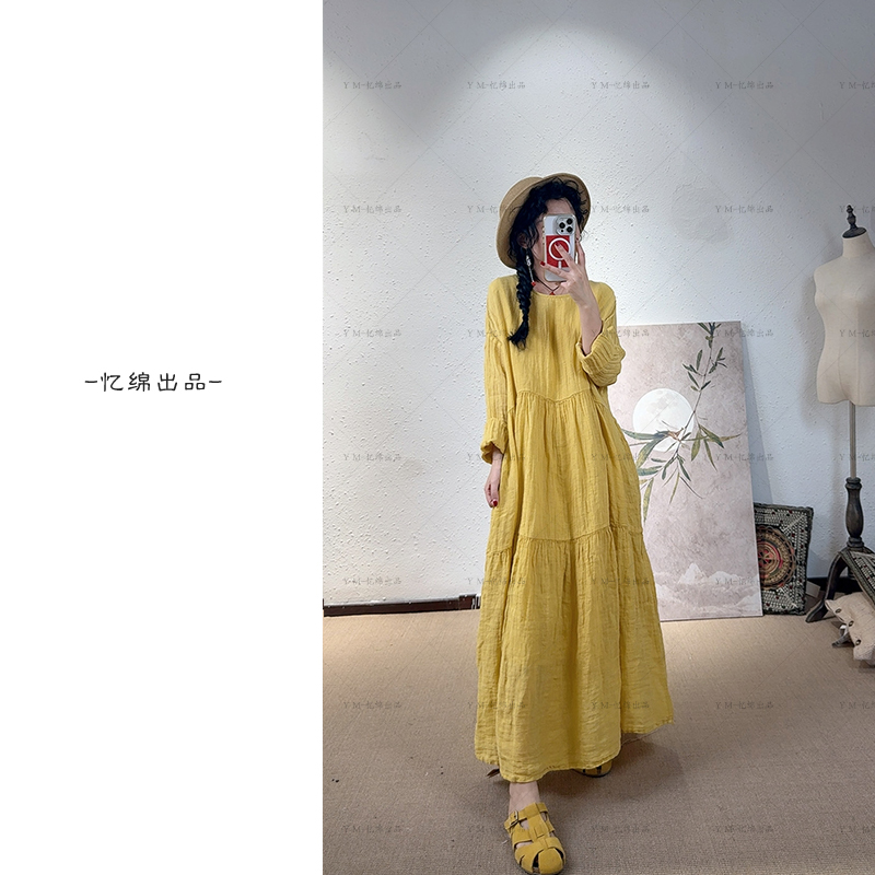 YIMIAN 秋上新小众圆领褶皱双层拼接亚麻气质连衣裙23500