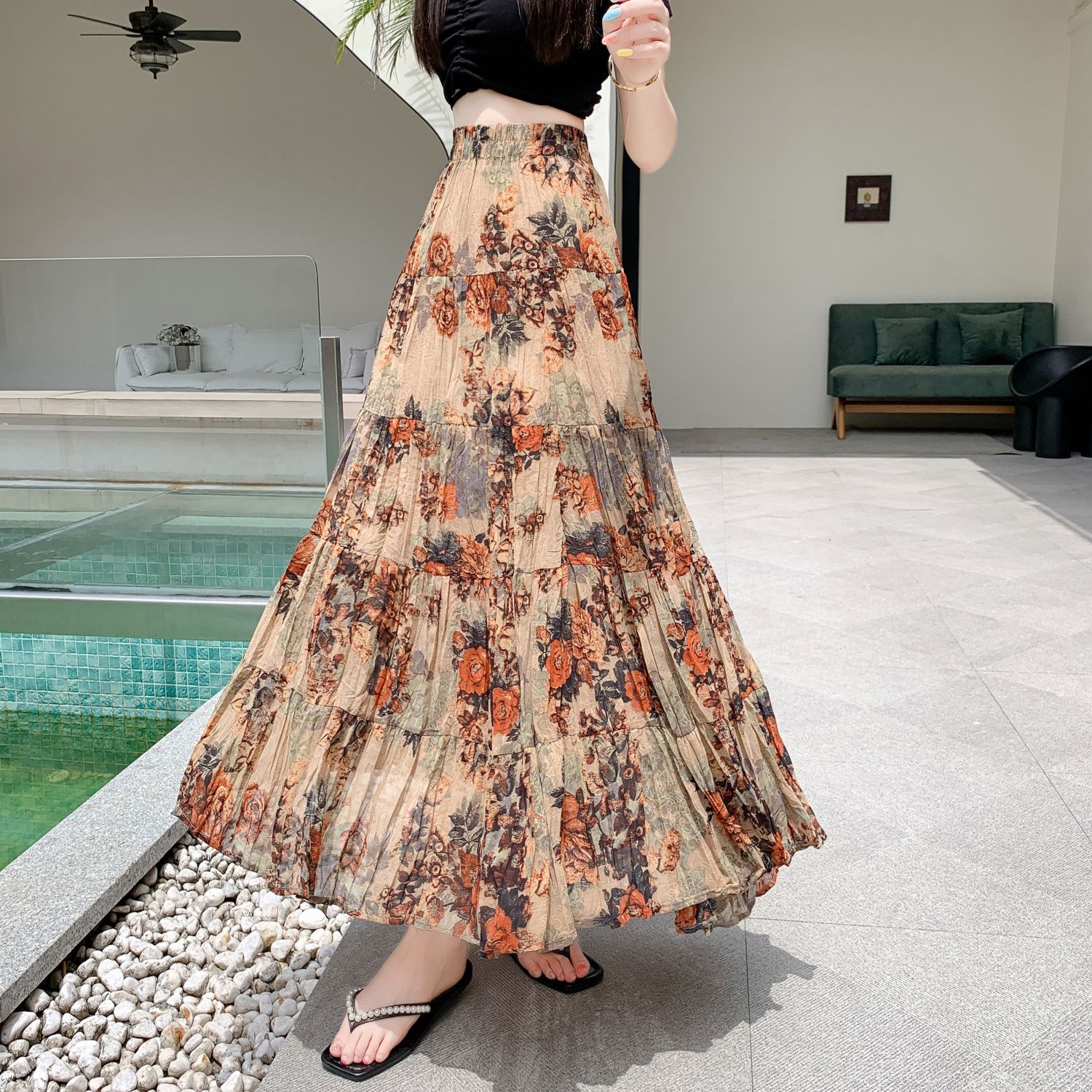 复古撞色碎花半身裙女2024夏季新款百褶裙高腰时尚飘逸雪纺褶皱裙