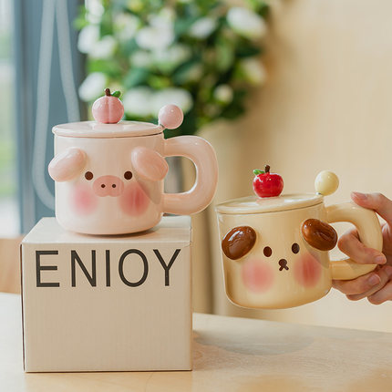 可爱小猪马克杯带盖勺女生日礼物陶瓷杯子办公室家用情侣咖啡水杯